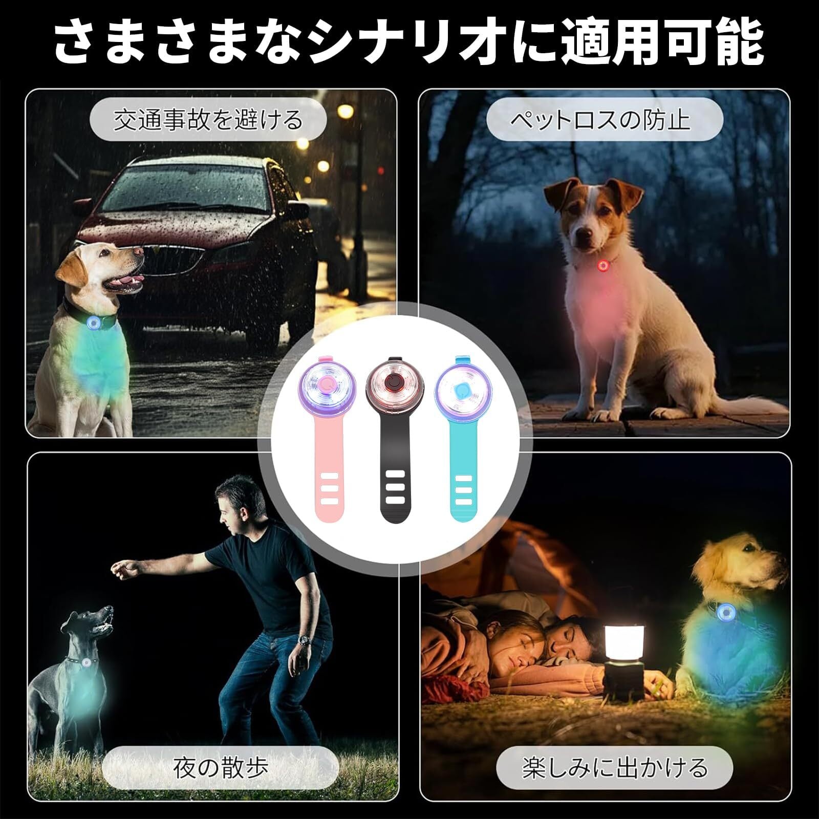 【4つの点灯モード】このペット用イルミネーションライトは、赤、白、青、ピンクの4つの点灯モードを備えています。ペットとのお出かけに最適で、迷子防止や夜間の散歩の安全性向上に役立ちます。夕方のお散歩に欠かせないアイテムです。
