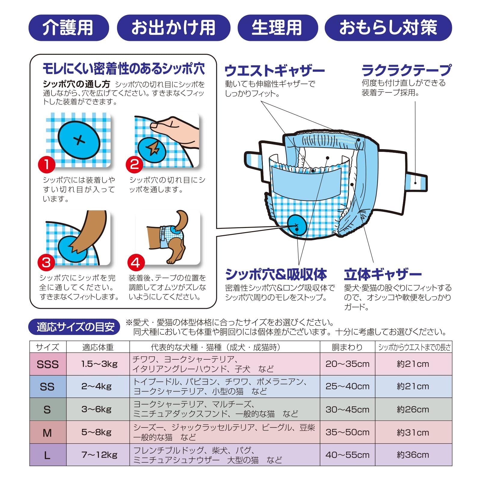 動いても安心W(ダブル)ホールド。介護用・お出かけ用・生理用・おもらし対策etc・・・快適な生活に! ! ぴたっと密着しっぽ穴でモレ安心! しっかり超吸収ガードで長時間安心! 車、カフェ、室内ドッグランや、猫ちゃんにもご使用いただけます。 胴周り: 30~45㎝、適応体重: 3~6kg、しっぽからウエストまでの長さ: 26cm、代表的な犬種・猫種(成犬・成猫時):ヨークシャテリア、マルチーズ、ミニチュアダックスフンド、一般的な猫 など