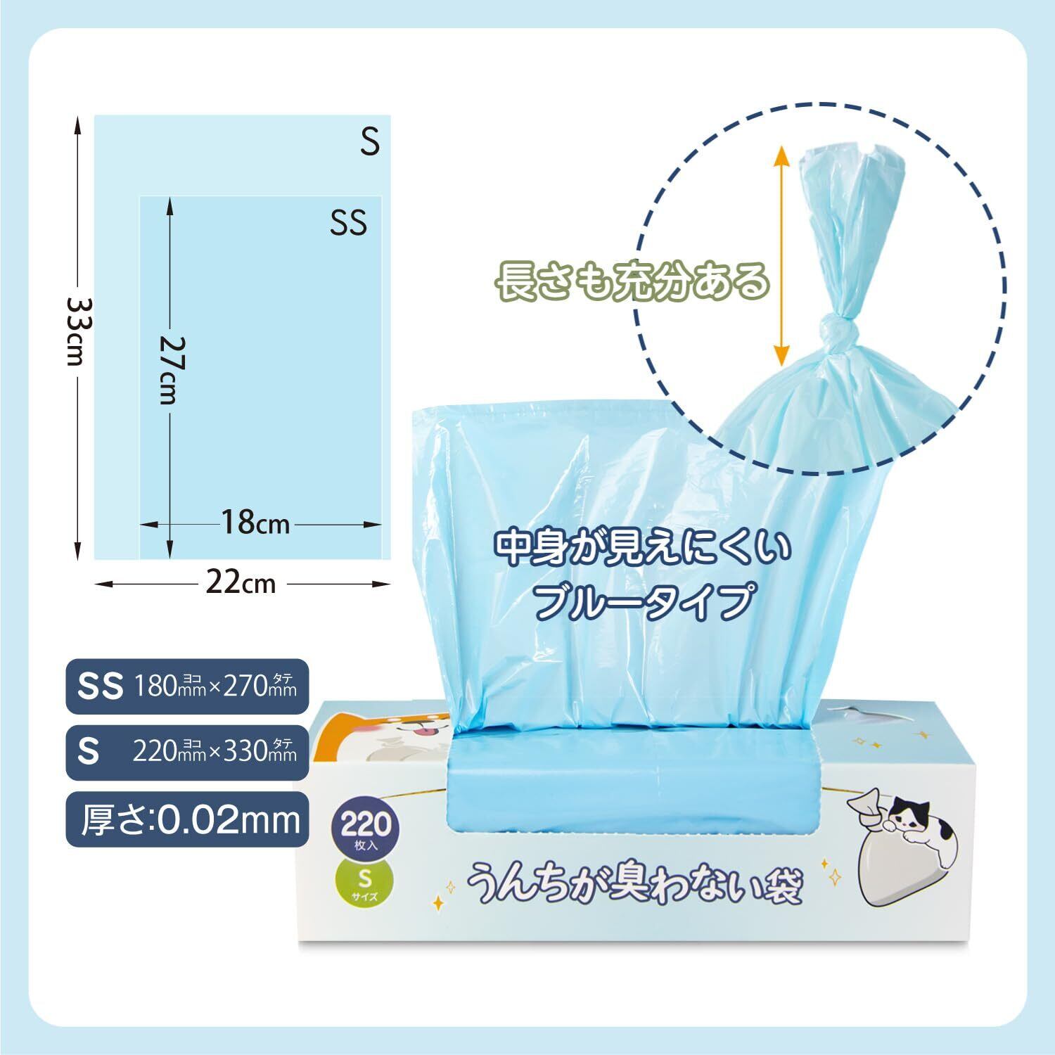 【数量限定】うんちが臭わない袋 犬うんち処理袋 Sサイズ 220枚×4個 (880枚) におわない袋 防臭袋 防臭ポリ袋 フン処理袋 無香料 お出かけ 車内 猫砂用 厚さ0.02mm 厚くて丈夫 箱入り コンパクト 持ち運び便利 サニタリー袋【袋カラー:ブルー】
