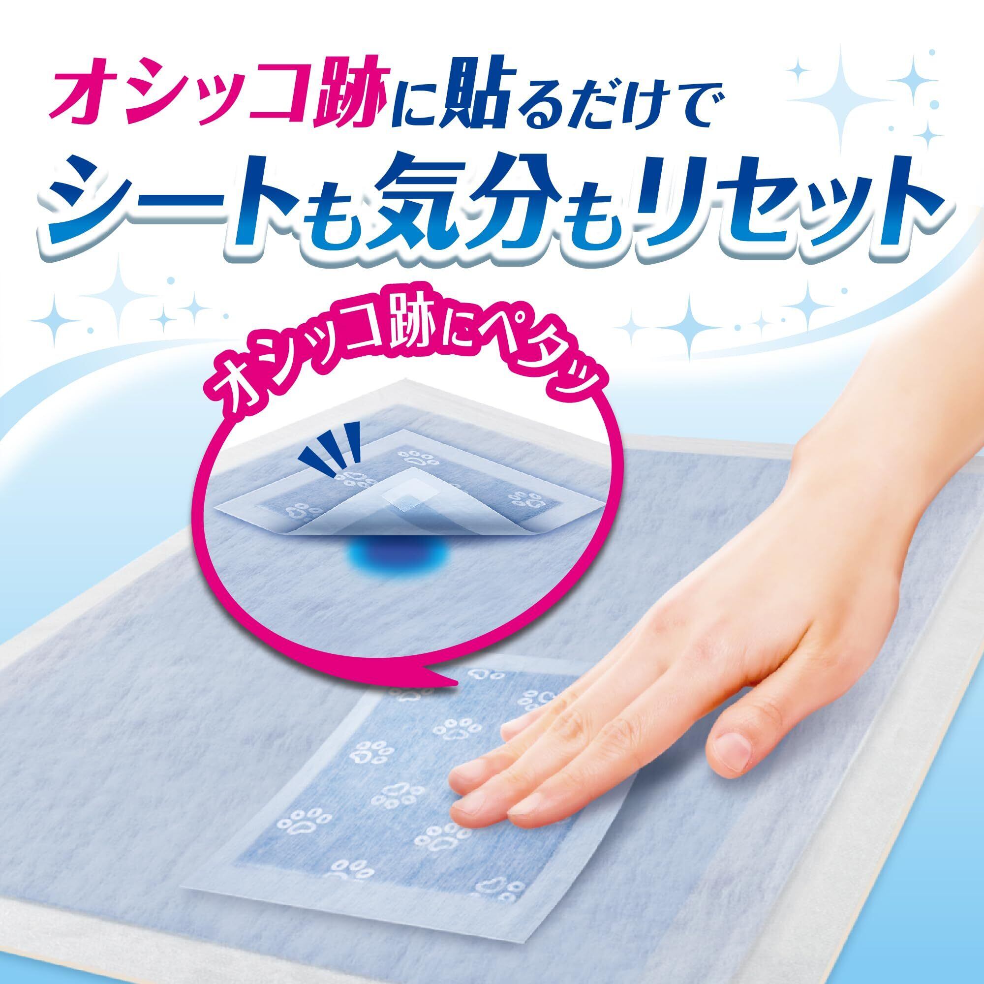 ・オシッコ跡の上からペタッと貼るだけでシートも気分もリセットできるキレイパッドです。 ・シートがまっさらになるのでワンちゃんが快適に繰り返しオシッコできます。 ・「キレイ」見た目も清潔でワンちゃん快適、「ラク」ペタッと貼るだけでシートを丸ごと交換しなくて良い、「エコ」1枚のペットシートを有効活用できゴミの量削減※ (※ユニ・チャーム調べ)