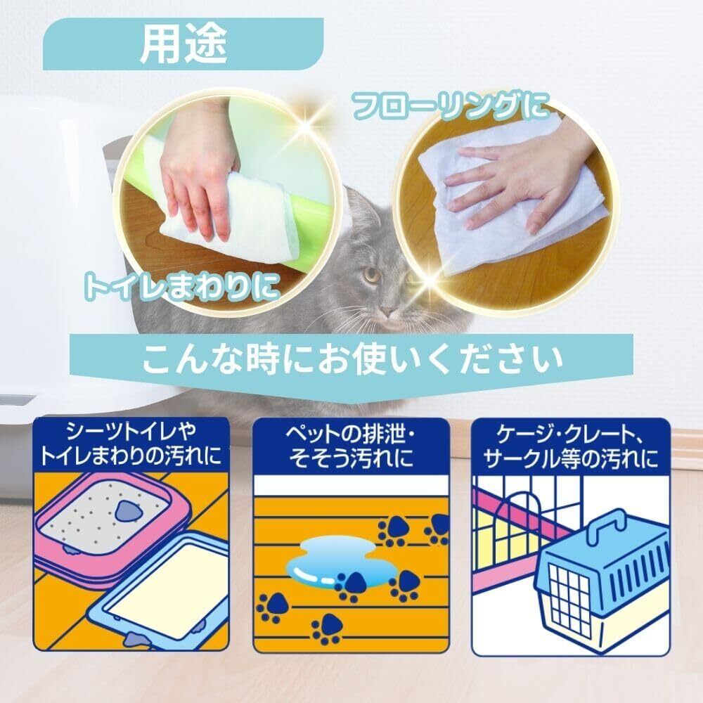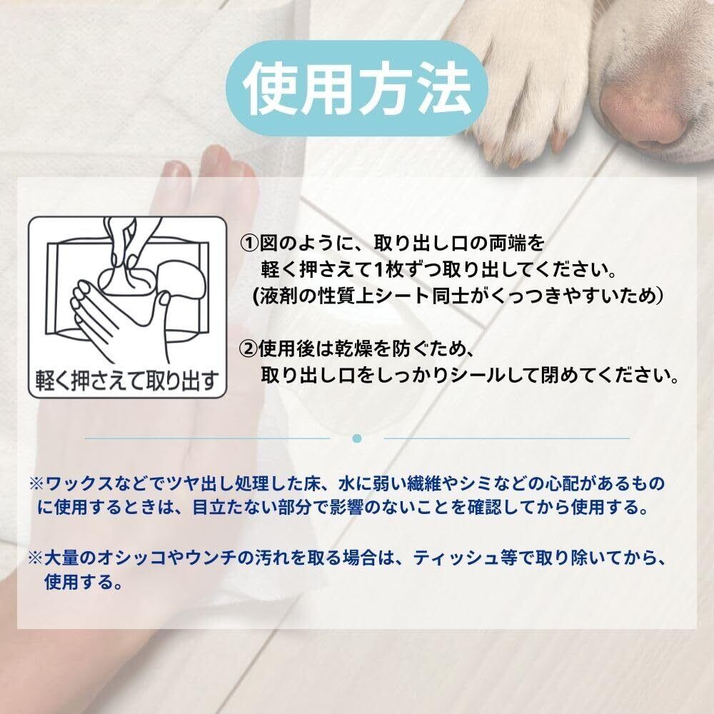 ・食品添加物原料洗浄剤により、オシッコやウンチ汚れをキレイに拭き取ります。 ・緑茶消臭成分が、オシッコやウンチのニオイをスッキリ消臭。 ・ウィルス99%除去!おそうじと同時に除菌もしっかり。 ・拭いたところをペットがなめても安心な成分を使用。 ・大判サイズなので、1枚で十分ふき取れます。