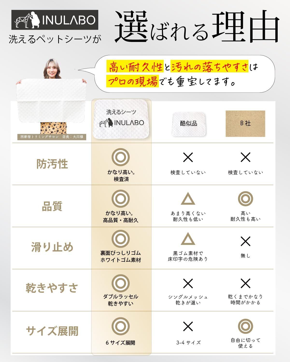 【おトイレがよく見える】 ワンちゃんの排泄物には、病気のサインがいっぱい。INULABOの洗えるシーツは、よく見える真っ白なシートなので、愛犬の変化にすぐに気づくことができます。また、ペット用品の多くは実用性にばかり着目され、デザイン性を軽視される傾向があります。INULABOの防水マットは、リビングに敷いても「トイレ感」がない純白に仕上げています。防汚性も抜群なので、お手入れもとっても簡単です。