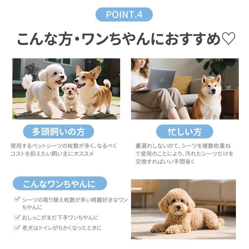 製品仕様:ワイド:45cm*60cm 数量:100枚×4袋(400枚入) 業務用や多頭飼育でこまめに取り替えたい方にオススメの経済的なペットシーツです。
