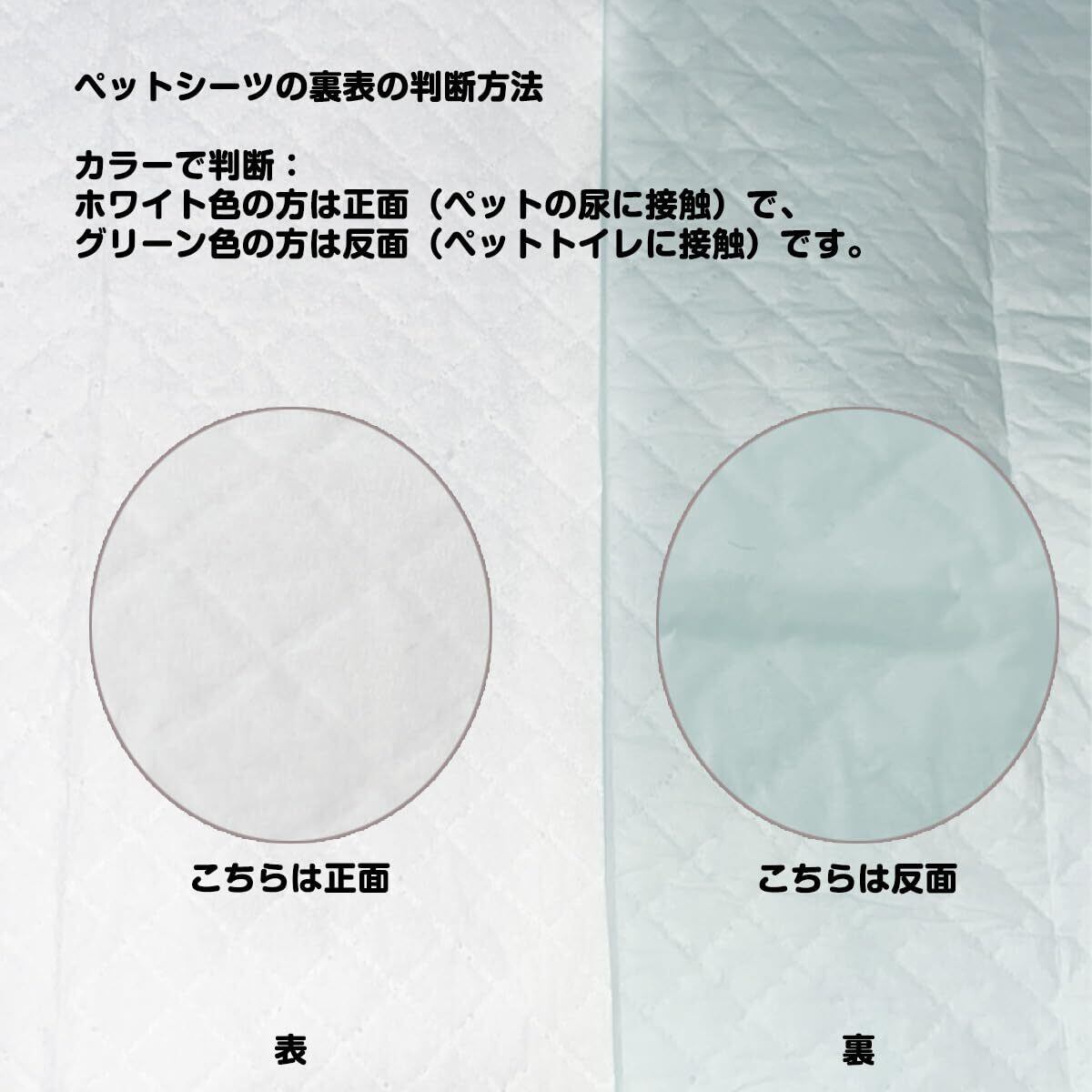 カラーで判断:ホワイト色の方は正面(ペットの尿に接触)で、グリーン色の方は反面(ペットトイレに接触)です。