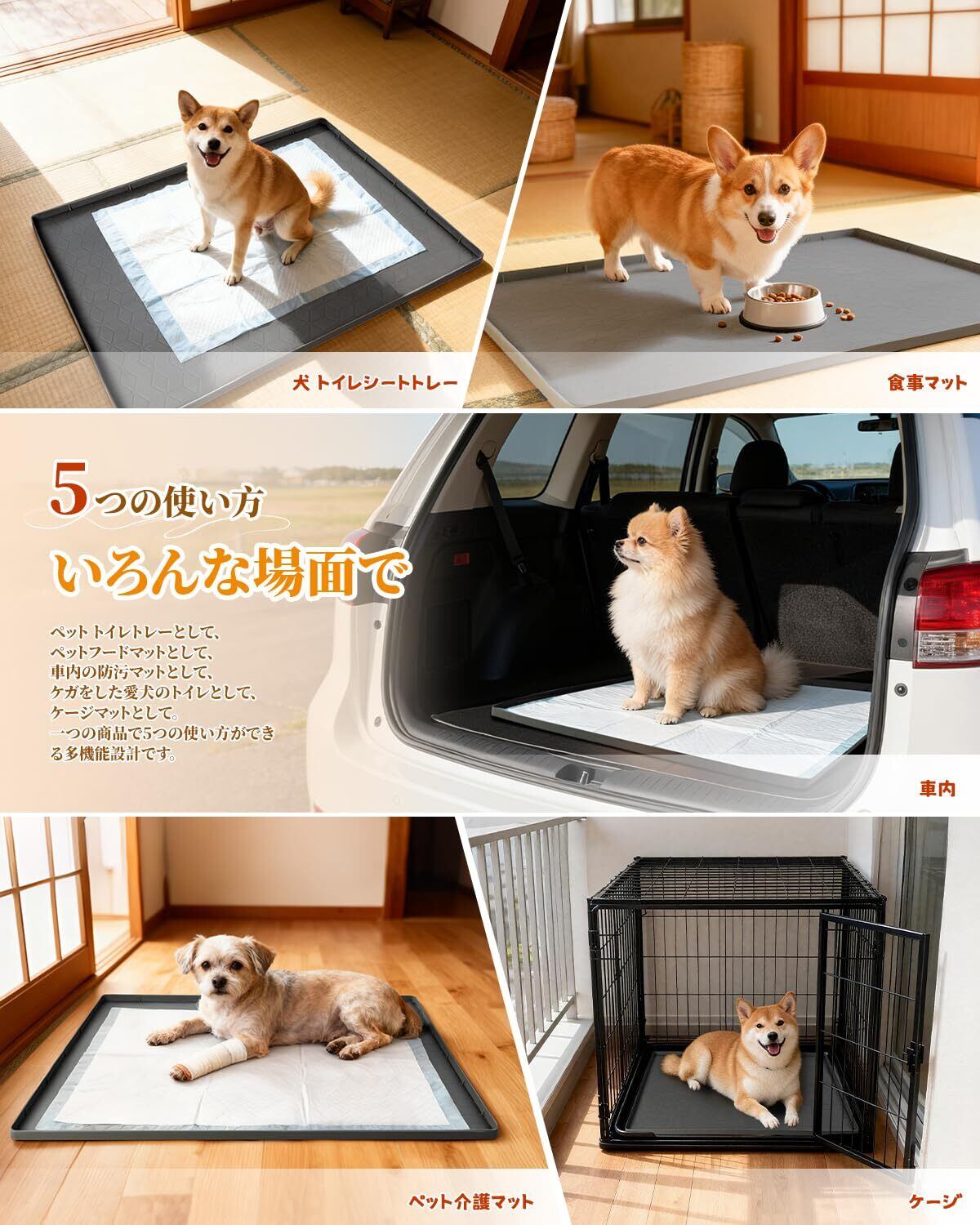 アイデアで広がる活用法:ペット トイレトレーとしてだけでなく、フードマットや車内マットなど、さまざまなシーンで活用いただけます。折り畳んで収納できるので、場所を選ばず便利です。