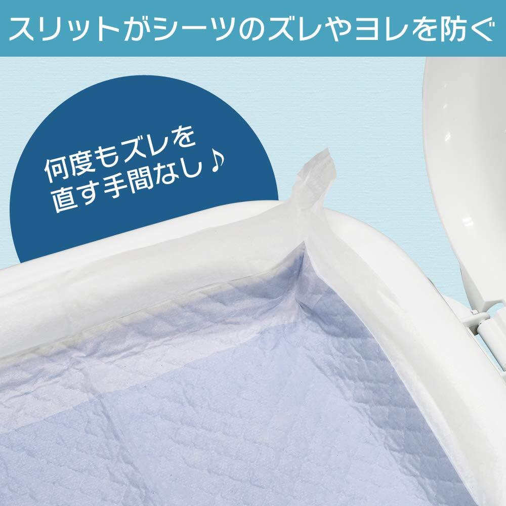 【おしっこが漏れにくい構造】:シーツのフチが立ち上がる構造でスキマ漏れをガード。シーツ裏へおしっこが回らないのでお掃除がしやすい。