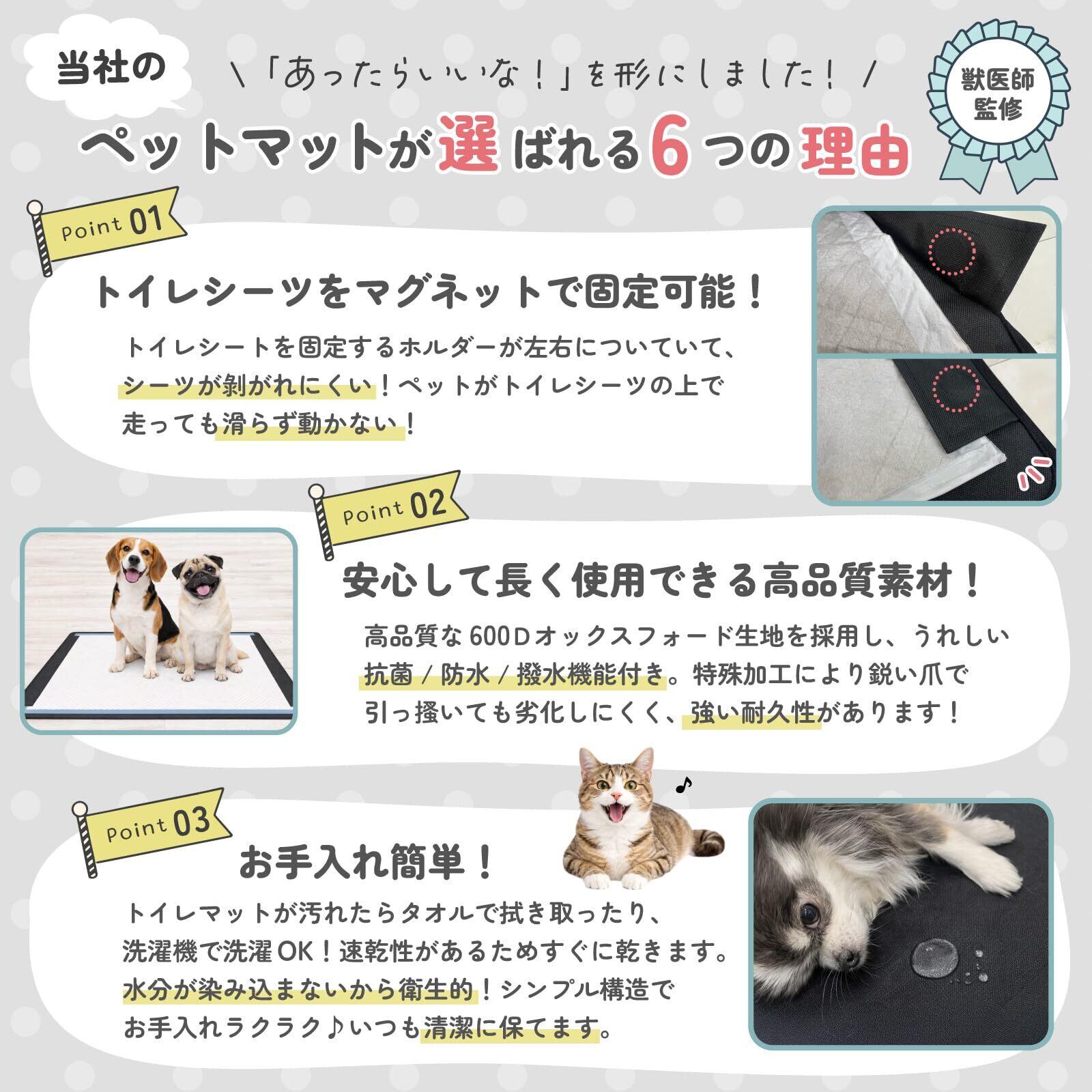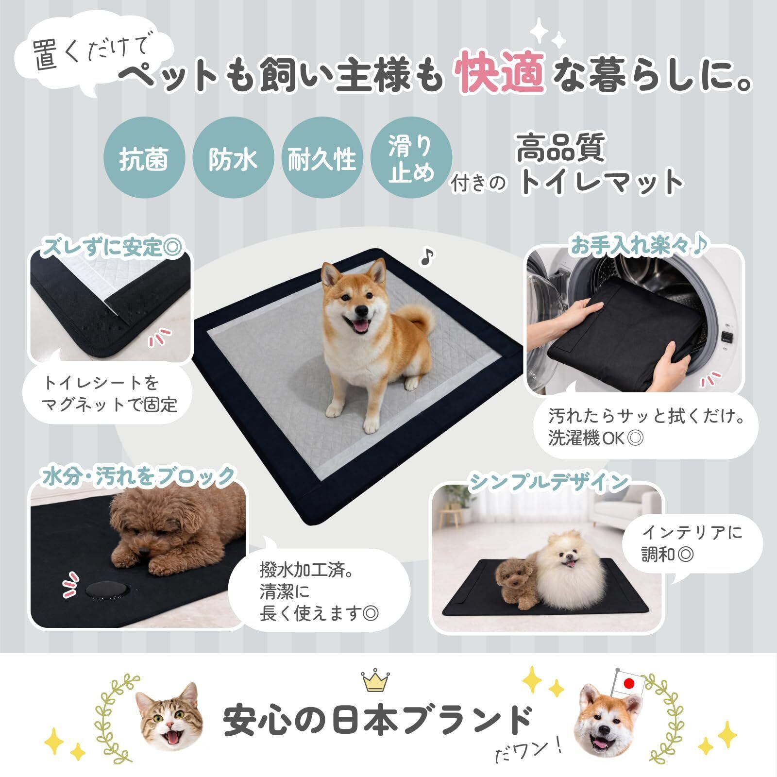 【もうペットの食べこぼしやおしっこ失敗に悩まなくなるペットマット】 置くだけで、ペットも飼い主も快適な暮らしに。トイレシートをマグネットで固定でき、床を汚さず清潔を保つ、高品質なトイレマット日常的に使うものだからこそ、お手入れのしやすさはとっても重要。マットが汚れたらタオルで拭き取ったり、洗濯機で洗濯OKだからお手入れラクラク!また、速乾性があるためすぐに乾きます。抗菌仕様で雑菌の繁殖も防ぎ、お部屋を清潔に保ちます。撥水加工済みであるため水分や汚れ等が染み込むことがなく、衛生的なペットマットを長くご使用いただけます。