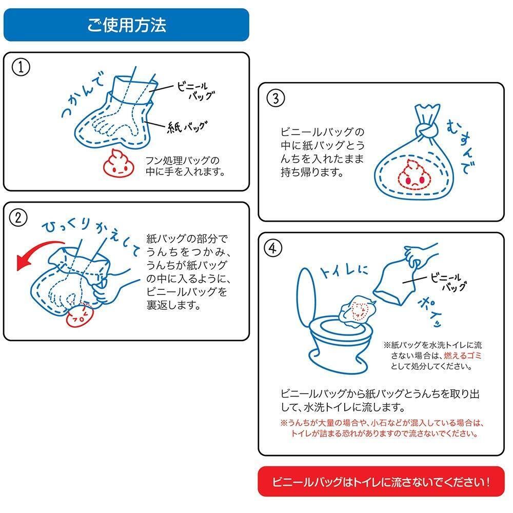 お散歩の必需品!紙パックごとトイレに流せるフン処理バッグ!せっけんの香りつき! 使用上の注意 ビニールバッグはトイレに流さないでください。また、うんちが大量の場合や、小石などが混入している場合は、トイレが詰まる恐れがありますので流さないでください。本品はペットのお散歩中に使用する、フン処理を目的とした袋です。その他の目的には使用しないでください。ペットがオモチャにしないようにご注意ください。また、お子様の手の届く所には保管しないでください。持ち帰ったビニールバッグの処理は自治体の定める区分に従ってください。また、ビニールバッグはトイレに流さないでください。 原材料・成分 ビニールバッグ:ポリエチレン 紙バッグ:紙(水溶性) 使用方法 ビニールバッグから紙バッグとうんちを取り出して、水洗トイレに流します。 ご注意(免責)>必ずお読みください お客様やペットにより安全で楽しい商品をお届けするため常に商品の見直しを行っております。そのためお買い上げの時期によって同一商品にも多少の違いが生じる場合がありますのでご了承ください。 続きを見る