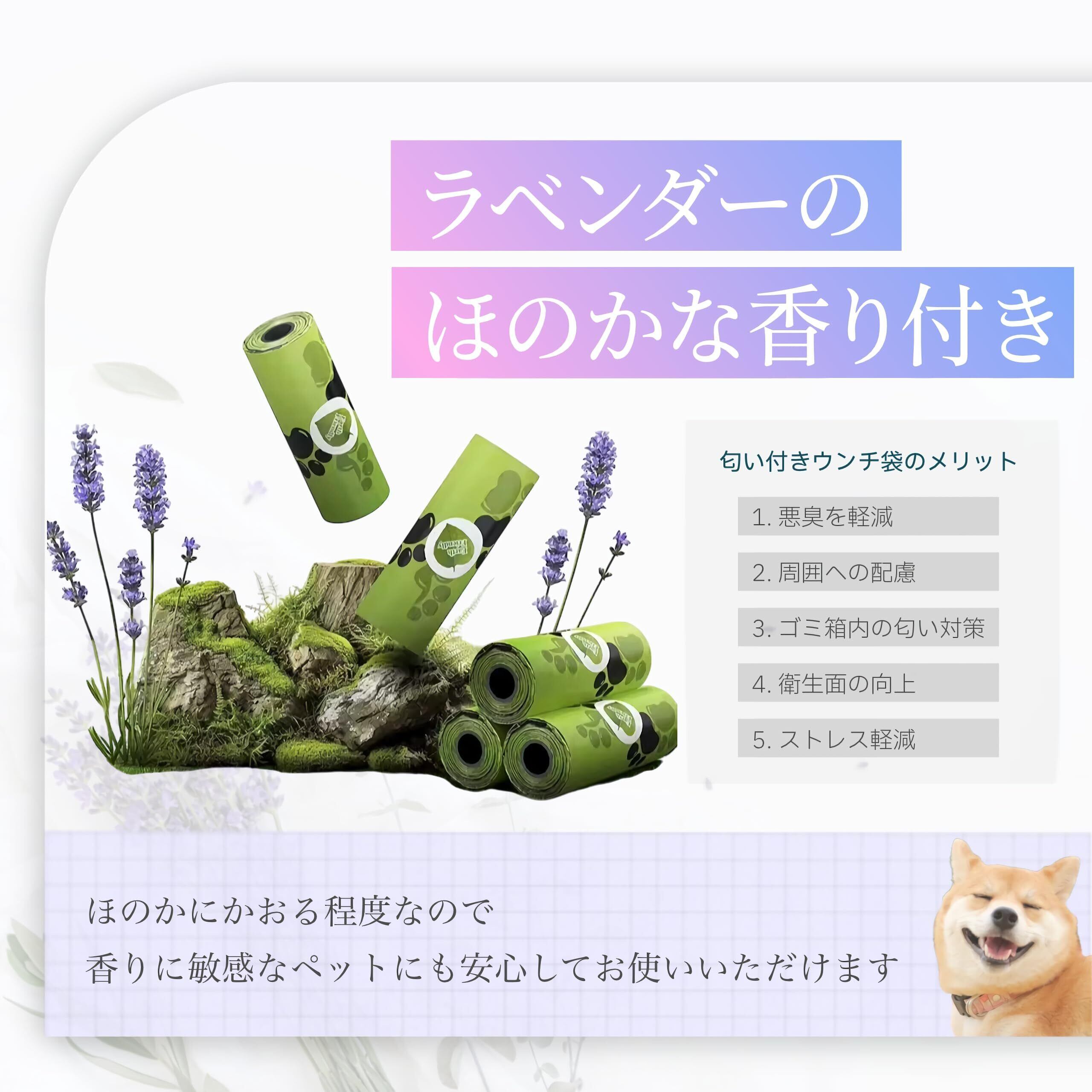 特徴:丈夫で破れにくく、わんちゃんの排泄物を処理した後も、香り付きのうんち袋のため、うんちの臭いが漏れにくく衛生的です。うんち袋の大きさが十分確保されているので、うんち袋の上部を結ぶだけの十分な大きさがあります。