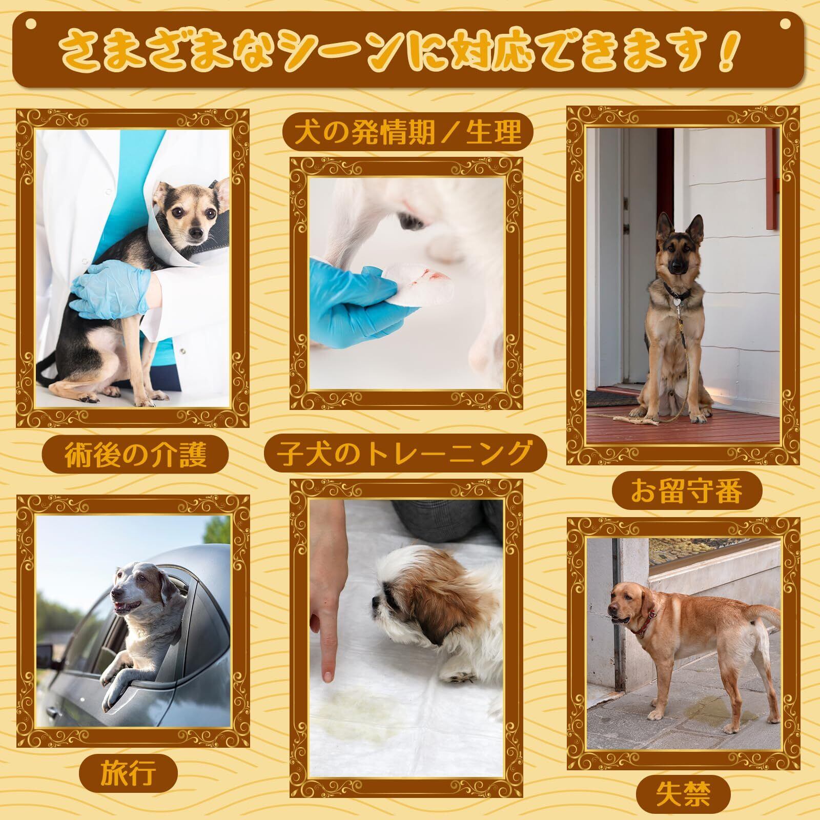 使用シーン:お留守番、お出かけ、老犬の失禁、避妊手術後の排泄サポート、病気の介護など、さまざまなシーンに対応します。主に女の子用ですが、適切なサイズを選べば、猫でも使えます。飼い主とペットが快適に過ごせるよう、良い設計です。