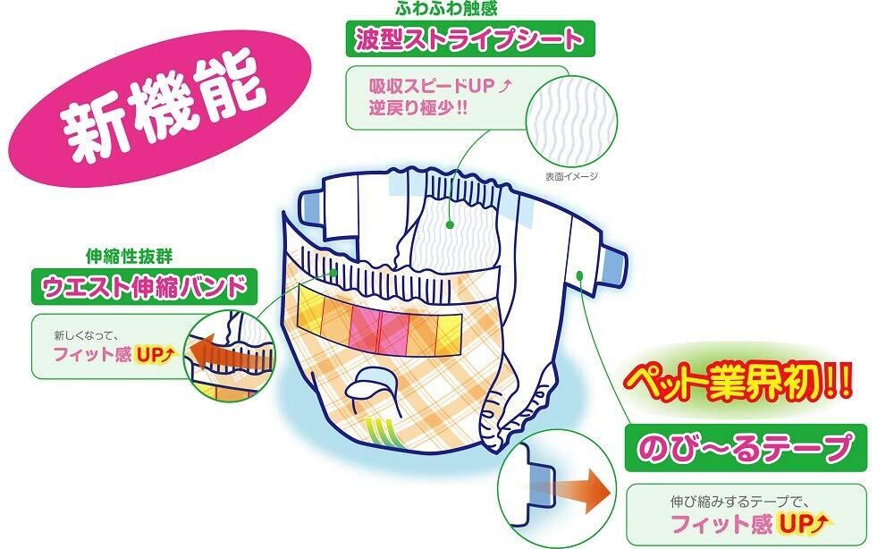 「おでかけ」「マーキング」「生理」「おもらし」「介護」など、パピーからシニアまでずっと安心して使える紙おむつです。 ■ピッタリフィット! 伸縮性のある新機能”のび~るテープ”と、”ウエスト伸縮バンド”でフィット感UP!! ■吸収力 新機能”波型ストライプシート”を採用し吸収スピードUP!逆戻り極小!ふわふわ触感で肌触りも抜群です。 ■動きやすい 一般的なペット用おむつに比べ、股ぐりを大きくカットして足回りをスッキリ動きやすくなりました。 ■色が変わる おしっこをすると「黄色」→「青色」に変わり、取かえ時期がひと目で分かります。