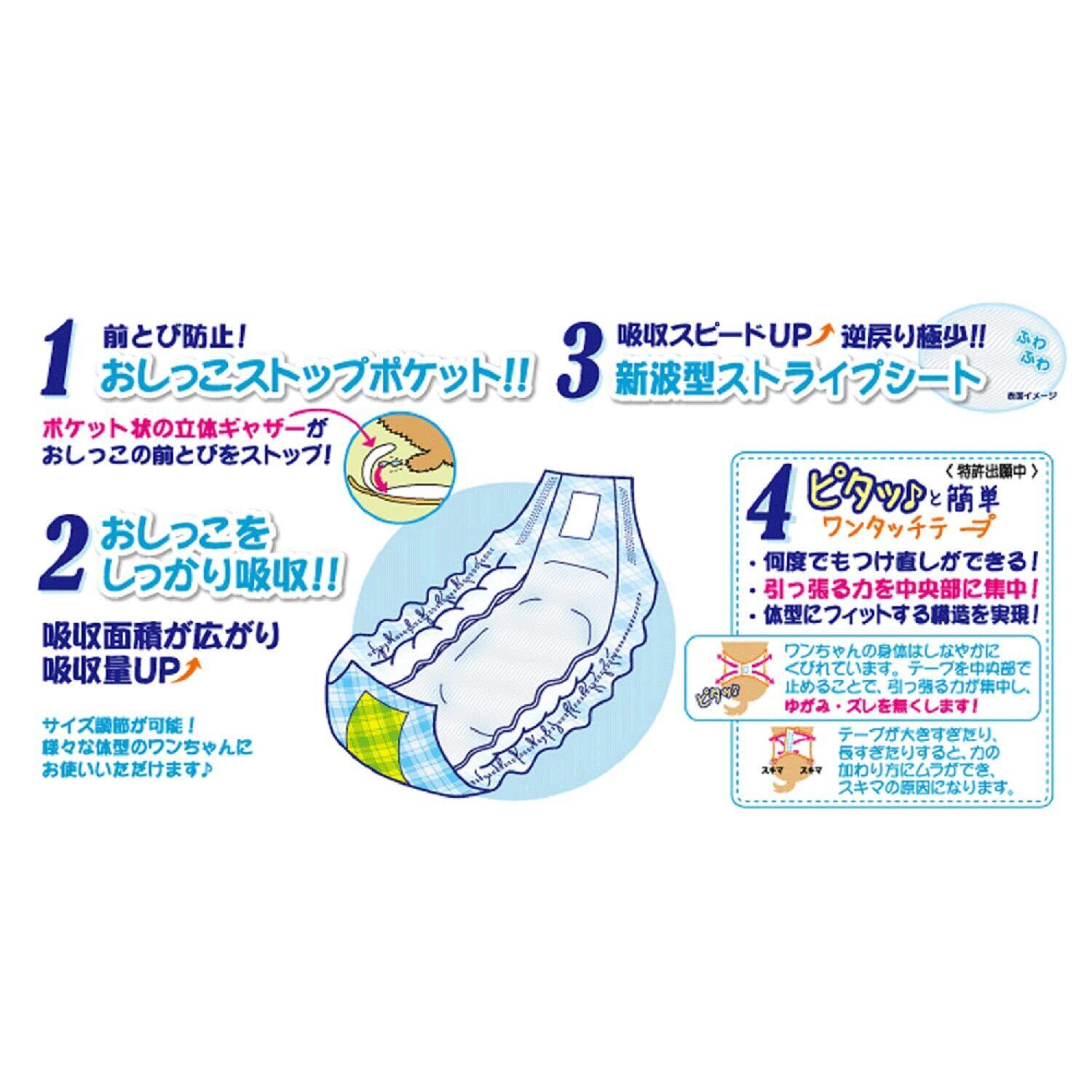「男の子のマーキング」「おもらし」「介護」「おでかけ」などの用途に使用できる、使い捨てタイプのマナーベルトです。吸収面積が広がり吸収力UP!! 新波型ストライプの表面材を採用し、吸収スピードUP! 逆戻り極少! 使用方法 内側のおしっこストップポケット(立体ギャザー)を起こします。愛犬の局部をやさしく包み込むように、おなか側から巻き上げます。吸収体の中心に局部がくるように当ててあげると、上手に装着できます。体にやさしくフィットするようにワンタッチテープを背中側でとめます。テープの位置は、愛犬に合わせて調節してください。