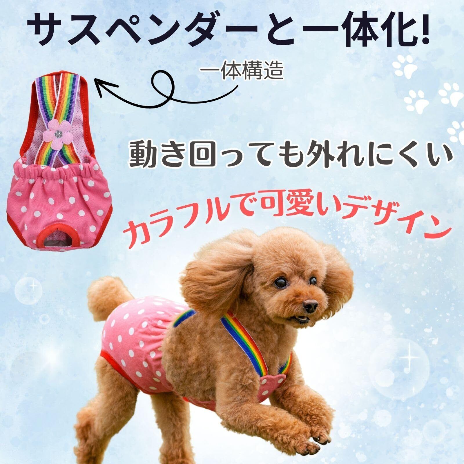 「せっかくおむつをつけてもすぐにズレちゃう…」「おむつを噛んでボロボロにしちゃう…」そんなお悩みを解決!このおむつカバーはサスペンダーが一体になっているから、しっかり固定できて外れにくいのが特長です。おむつを噛んで破ってしまうワンちゃんにもピッタリで、漏れや汚れの心配も減らせます。さらに、可愛いデザインにもこだわり、ドット柄やくま柄をラインナップ。シンプルなおむつ姿もこれならオシャレに見せられます。日常の介護や生理時はもちろん、おでかけや旅行時などにも便利。機能性とデザイン性を両立した“ありそうでなかった”ペット用おむつカバーです。