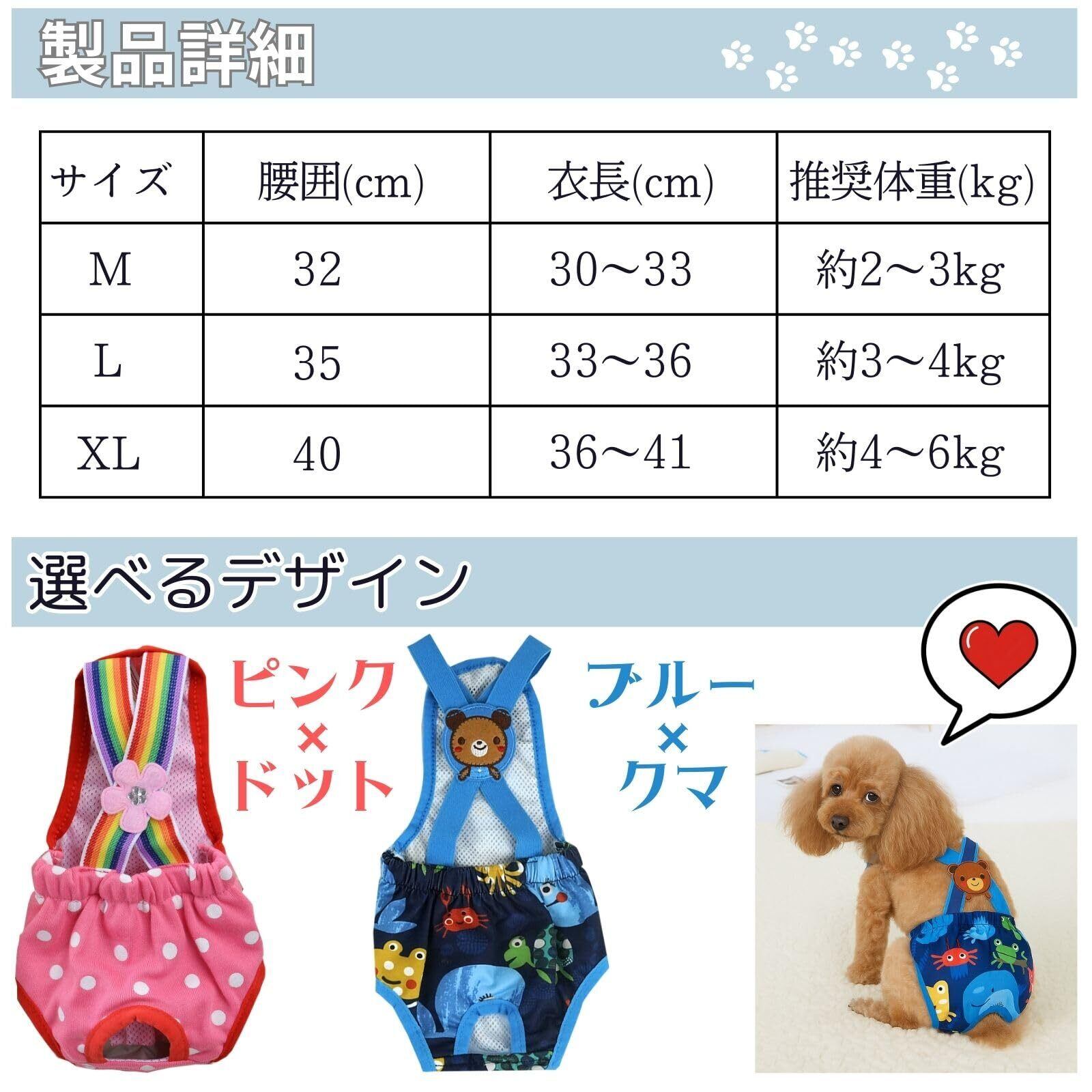 【製品サイズ】Mサイズ:腰囲 32cm/衣長 30〜33cm/推奨体重 約2〜3kg Lサイズ:腰囲 35cm/衣長 33〜36cm/推奨体重 約3〜4kg XLサイズ:腰囲 40cm/衣長 36〜41cm/推奨体重 約4〜6kg