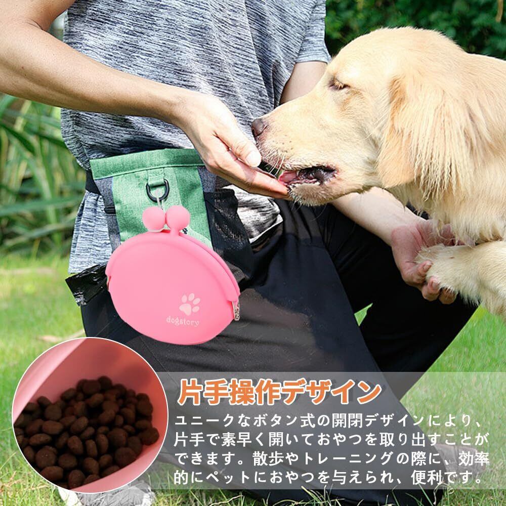 片手操作デザイン:ユニークなボタン式の開閉デザインにより、片手で素早く開いておやつを取り出すことができます。散歩やトレーニングの際に、効率的にペットにおやつを与えられ、便利です。