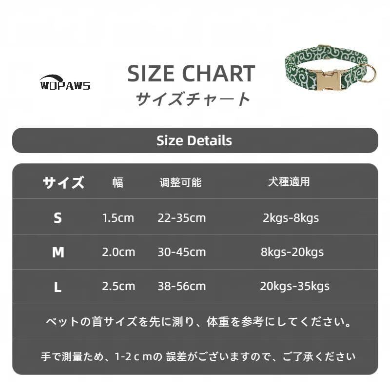 Sサイズは幅1.5cm、22~35cm間に調整可能(Sサイズの首輪の重さに気にする小型犬にはにはお勧めしません)小中型犬に対応。Mサイズは幅2.0cm、30~45cm間に調整可能で、中型犬に対応。Lサイズは幅2.5cm、38~56cm間に調整可能で、大型犬に対応。
