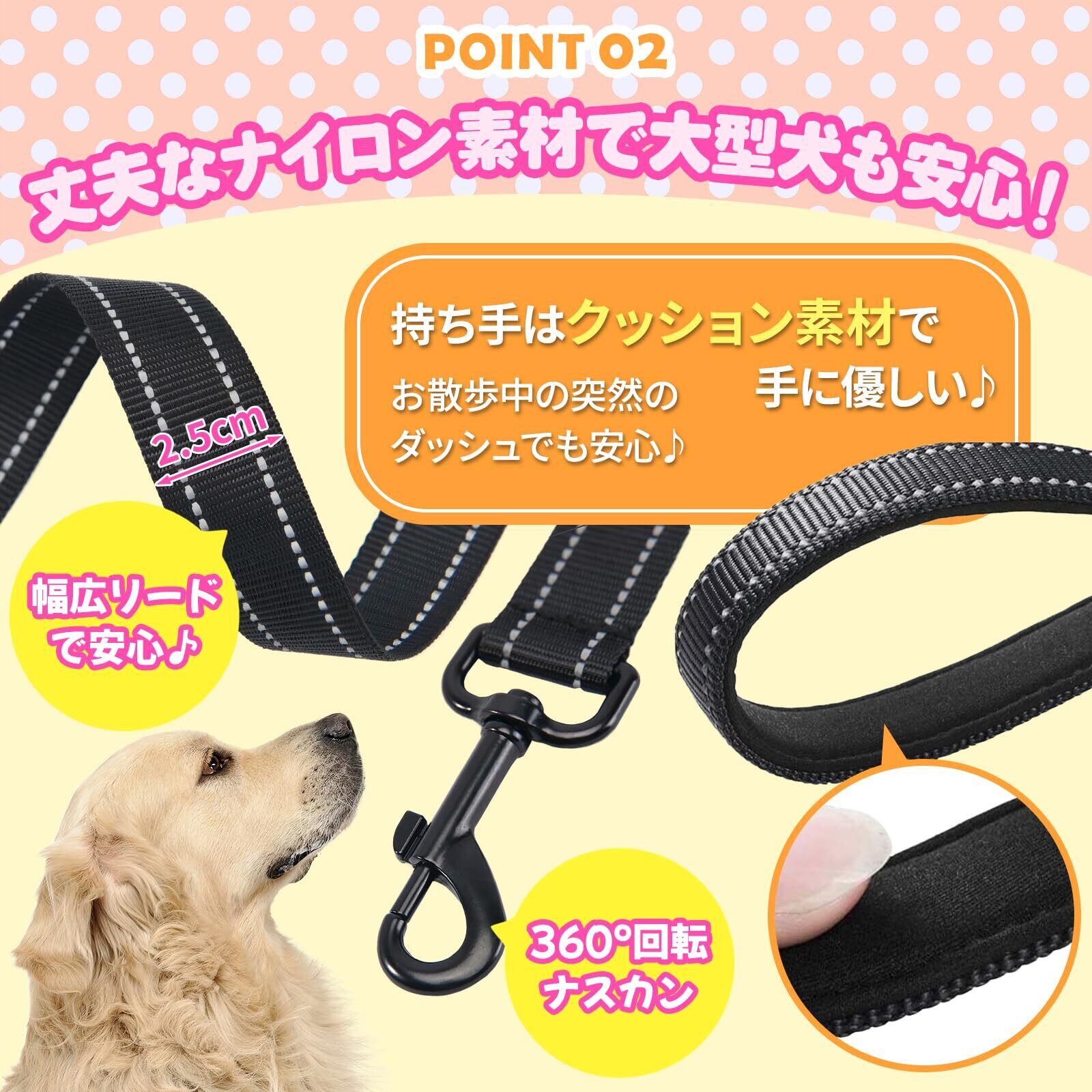 丈夫なナイロン素材で小型犬から中型犬、大型犬にも対応。持ち手はクッション素材で手にやさしい。お散歩中の突然のダッシュでも安心です。