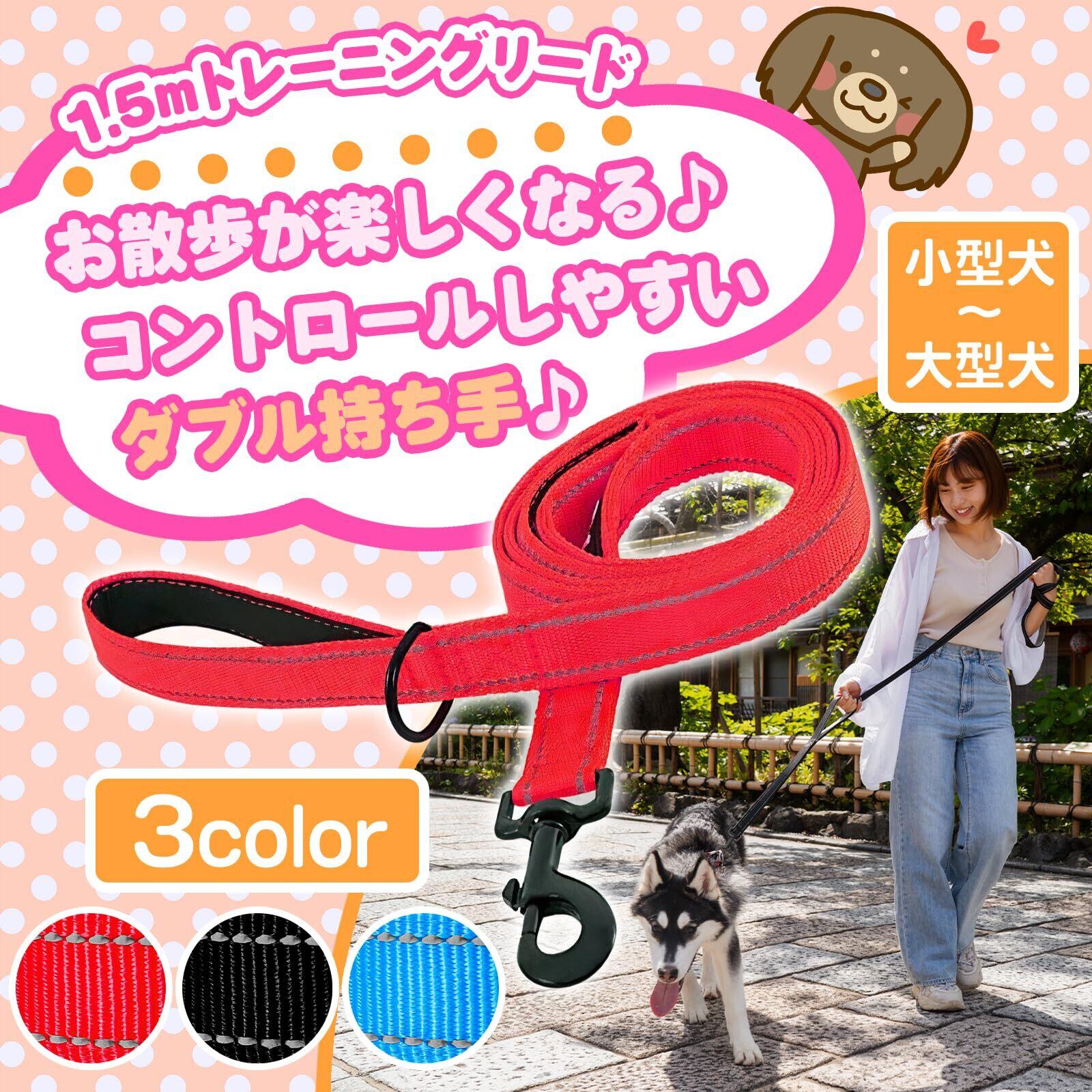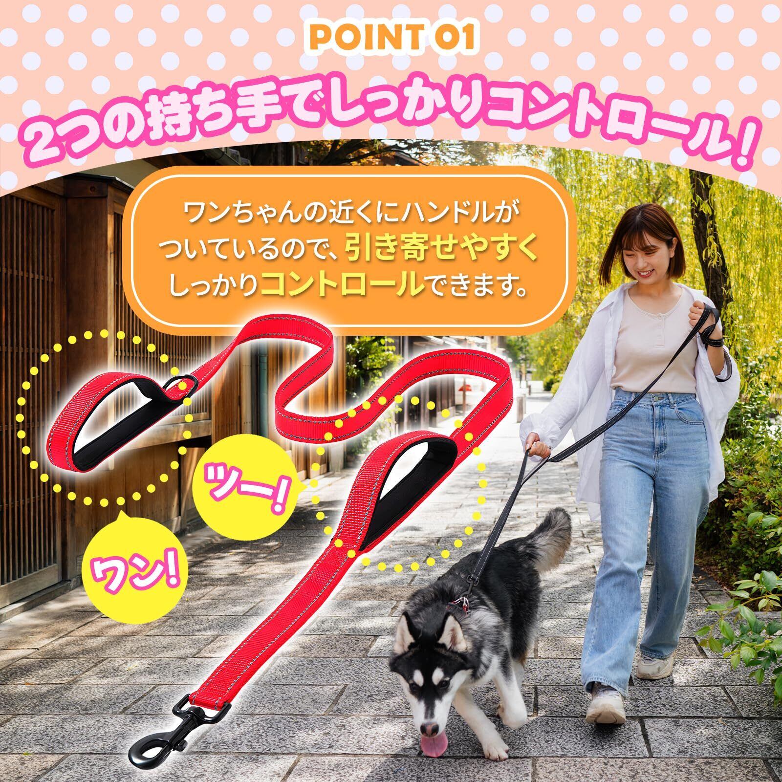 犬の散歩、しつけ、訓練までOK。トレーニングリードです。引き寄せしやすい持ち手2個、1.5mのロングリード、丈夫なナイロン素材、夜間安全な反射板付きです。