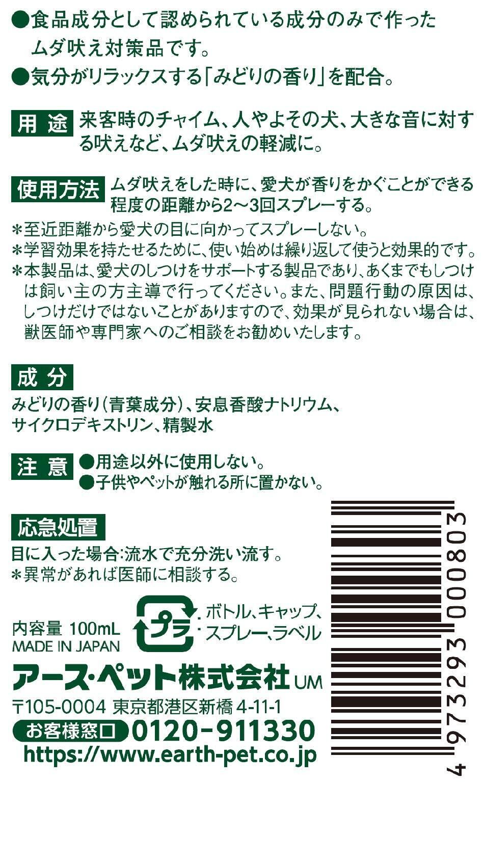 ● 食品成分として認められている成分のみで作ったムダ吠え防止剤。● ストレスを軽減する効果が確認されている、「みどりの香り」を配合。