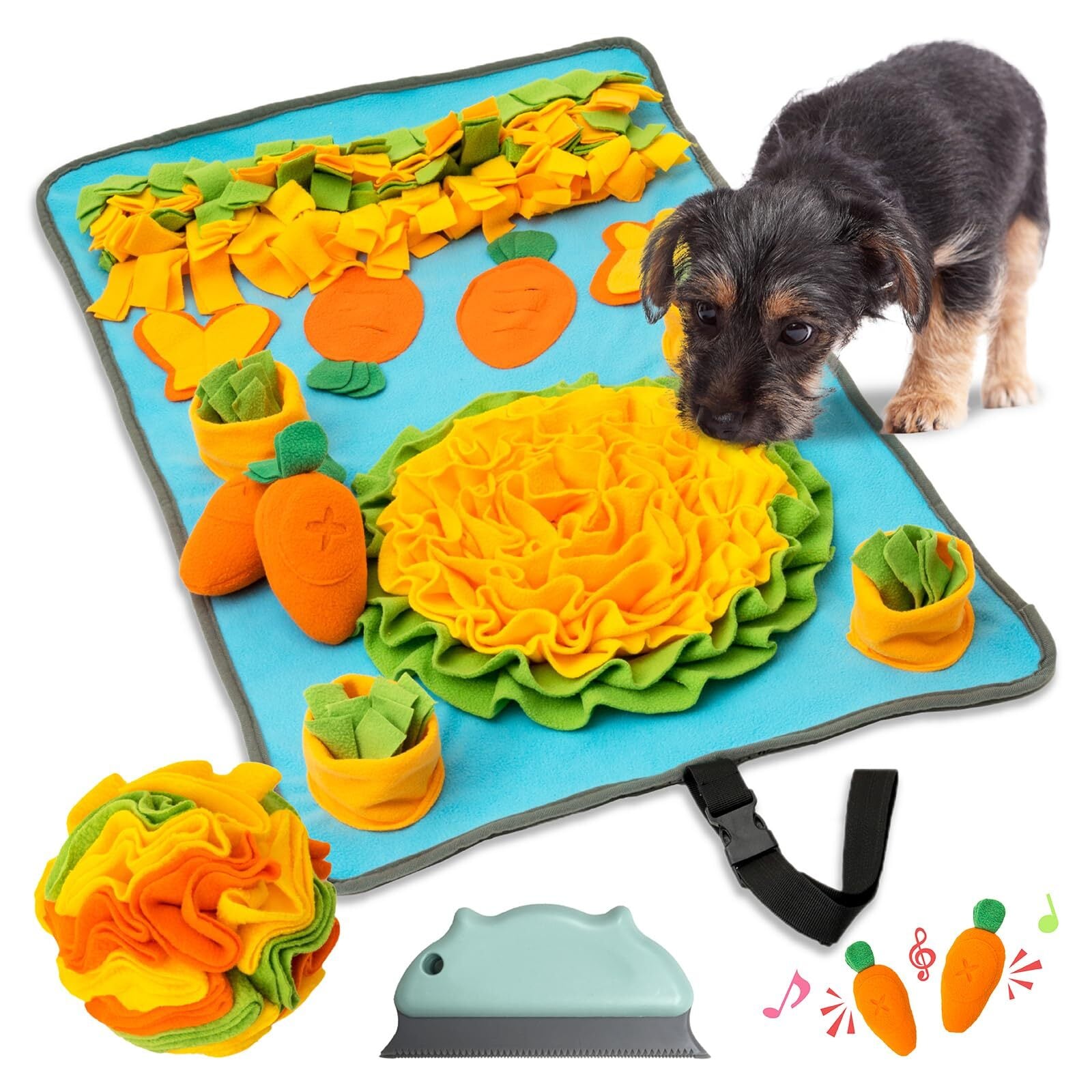 【主なセット内容/商品特徴】毛とりブラシ(緑色)付き!✨にんじん畑(にんじん2本) + 複数エリアのカラフルノーズワークマット +『α』 ノーズワークボール✨マット自体の難易度は【A】よりやや低めのため初心者におすすめ。慣れてからも飽きがこないように、さらに難易度が高いとされるノーズワークボールをセットに。まずはマットに慣れてからボールを使いましょう。