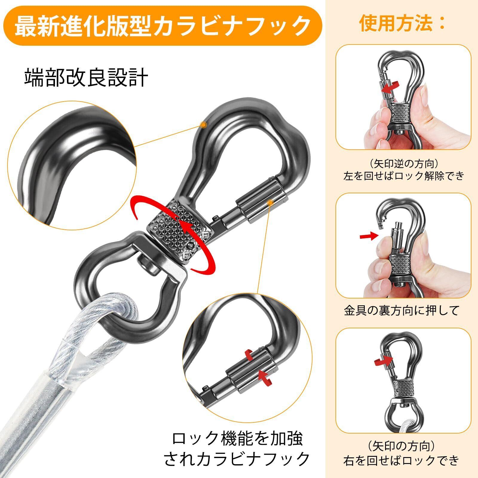 【カラビナ リード 犬】外飼い リードは内蔵され金属製のクリップも加厚され、より耐久性を持ちます。簡単に脱い出せません。テザーケーブルの一方の端は木に取り付けられとか、金属製ドッグポールにしっかりと固定されるとか。もう一方の端は、ドッグカラーまたはシートベルト、犬の首輪に取り付けることができます。外飼いや犬を係留する時絡まにくくて、便利に使えます。リード ケーブルは各サイズがあって、小型犬、中型犬、大型犬までご利用できます。