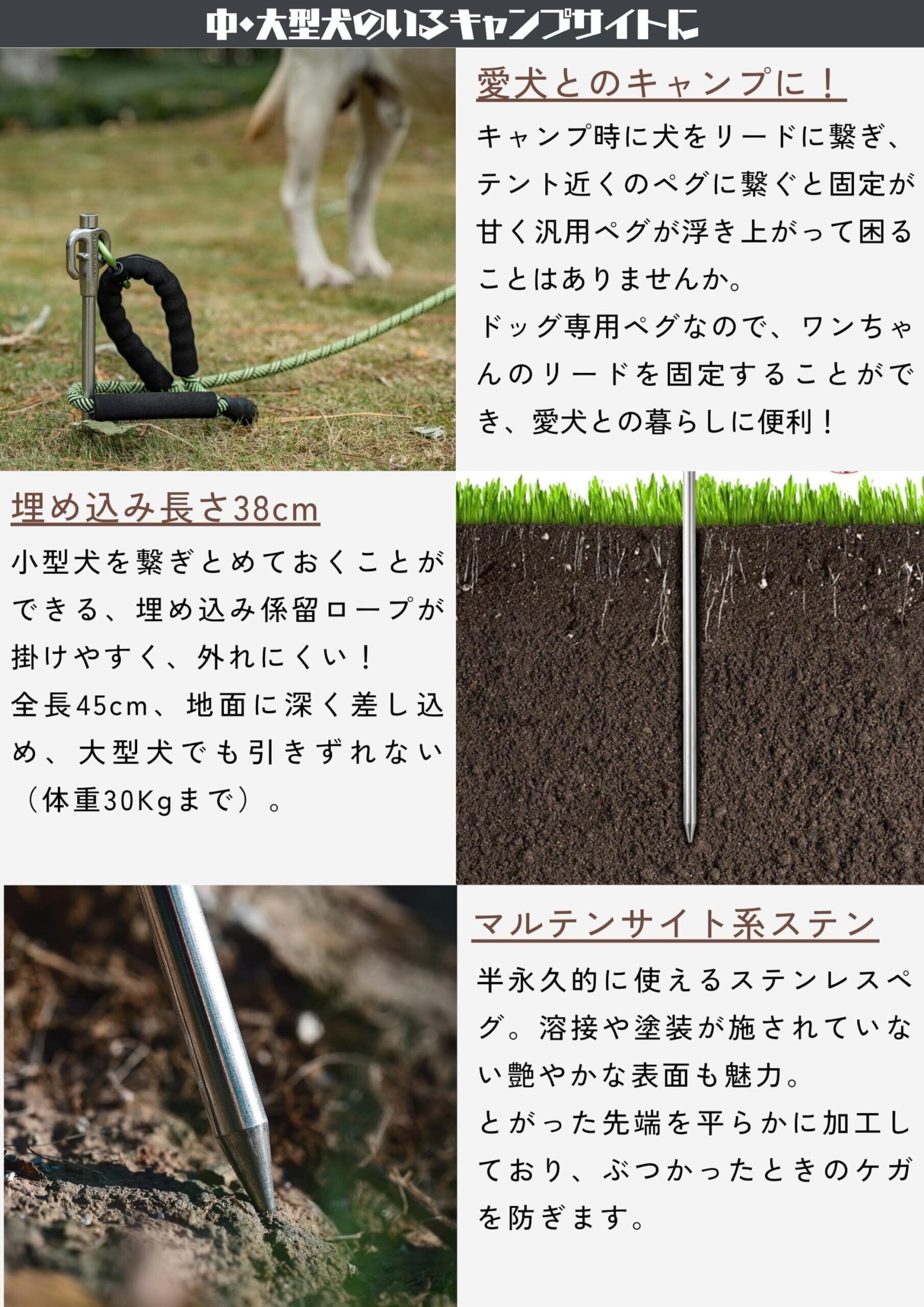 しっかりしたつくりのステンレス製係留具。 ペグは回転するので、ワンちゃんのリードが絡まりません。ポールや木がない際に役に立つ、リードの係留用アンカー。