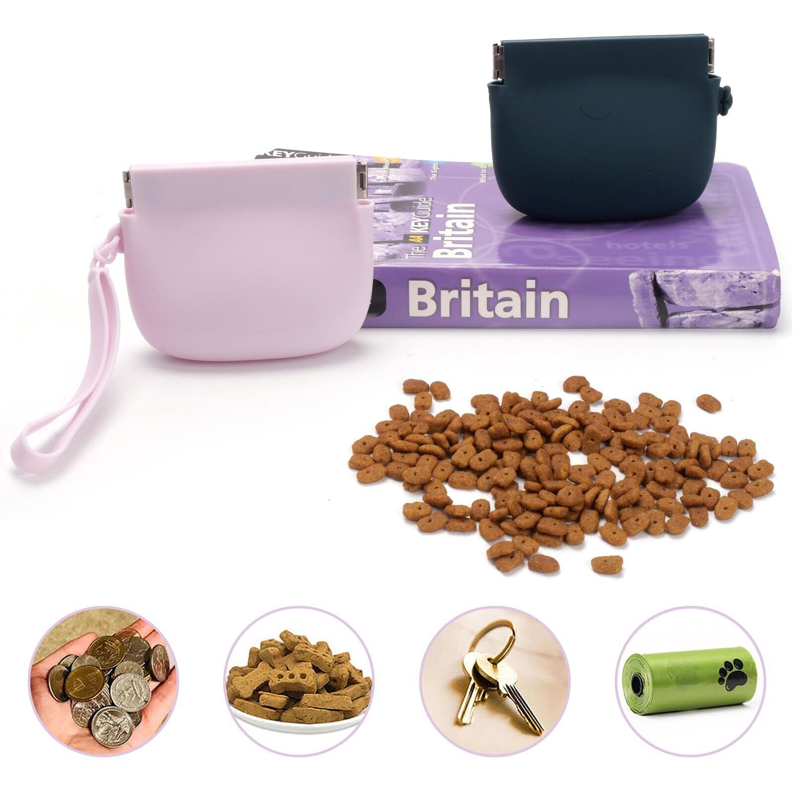 VOSO 2個セット シリコン製ドッグトリーツポーチ 小型ペットおやつバッグ 犬猫用|自動開閉機能付き|トレーニングクリッカー付き|ポケットサイズ・お手入れ簡単・無臭|ペットの旅行やアウトドアに最適 (ダークグリーンとライトパープル)