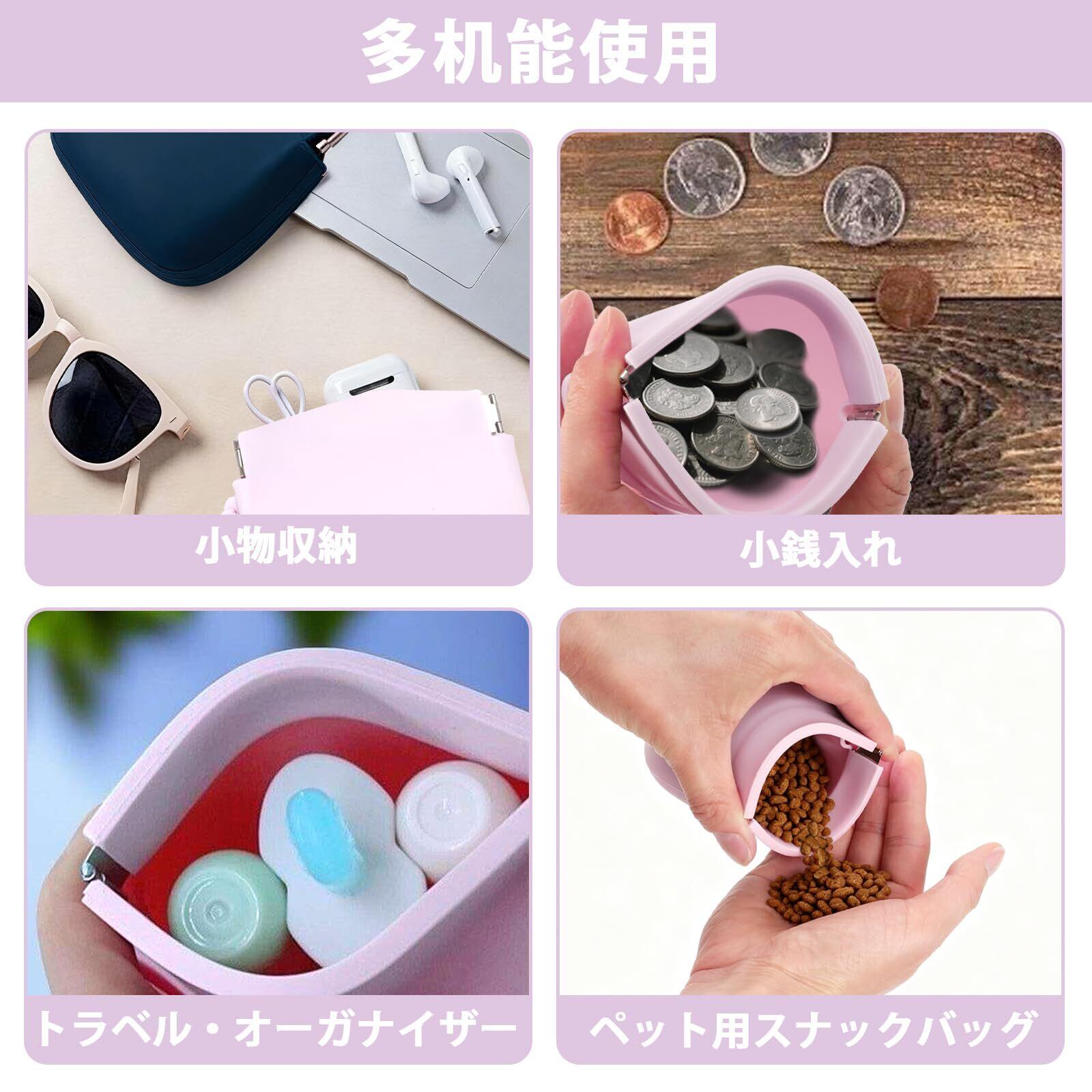 【おしゃれで多用途】 シンプルでおしゃれなデザインは日常使いにもぴったり。小さなおやつから大きめのビスケットまで幅広く収納可能。広めの開口部と柔らかいシリコン素材により、出し入れもラクラク。また、コインケースや鍵入れとしても使用できる多機能アイテムです。