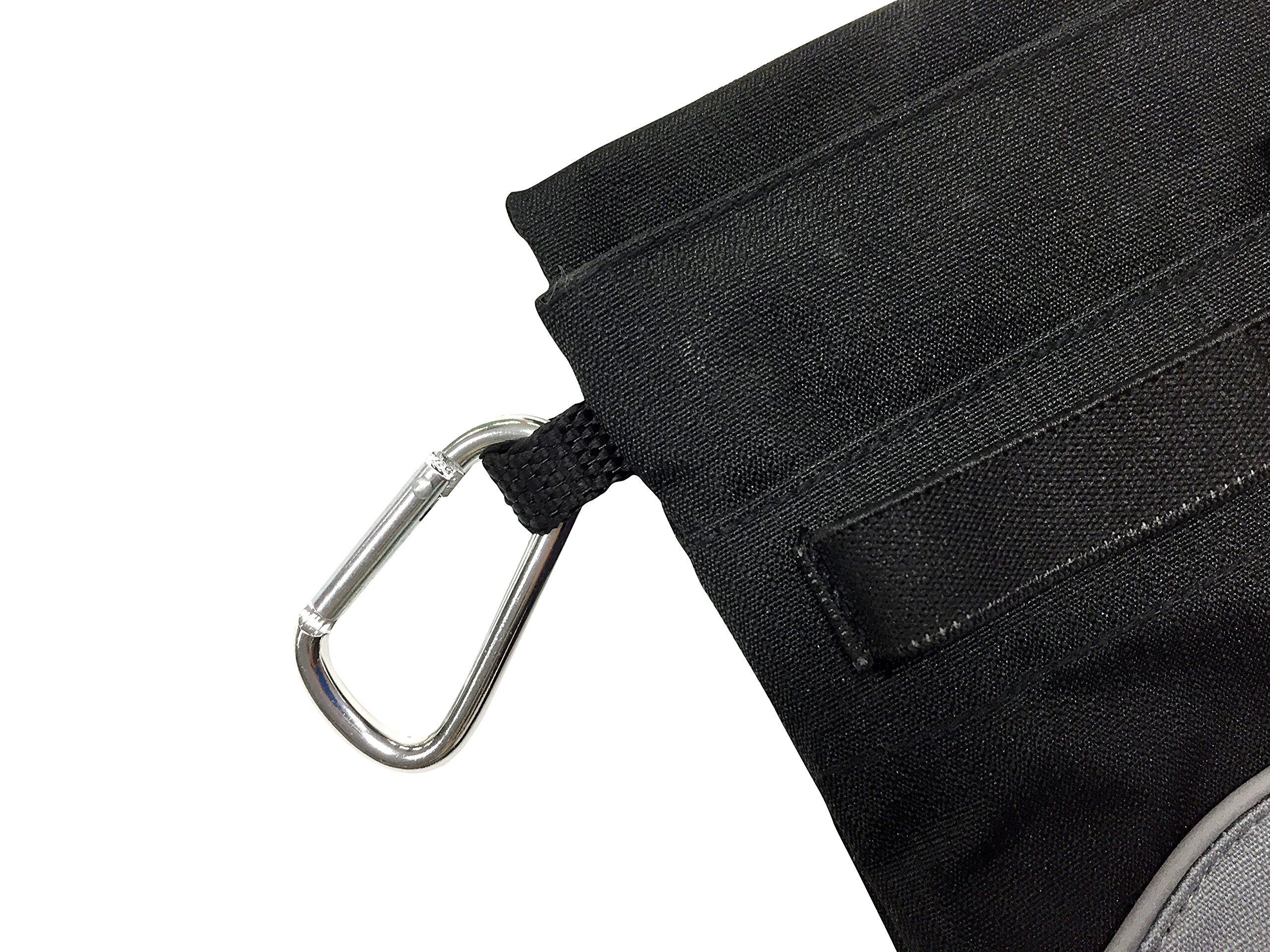 撥水加工された汚れにくい生地を使用。ベルトクリップ、調整可能ベルト、カラビナ付きで幅広い使い方が可能です。
