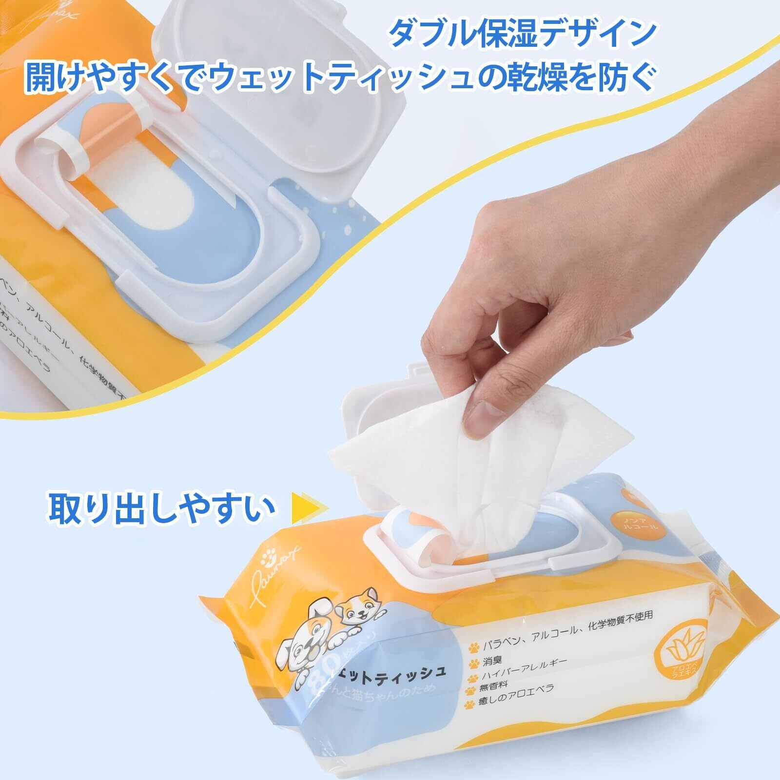 【なめても安心】:Pawnaxペットウェットティッシュはノンアルコール、パラベンフリー、純水99%、無香料タイプです。天然アロエエキス、カミツレエキス、ビタミンEが含まれて、すべて天然成分で、なめられても心配ないです。