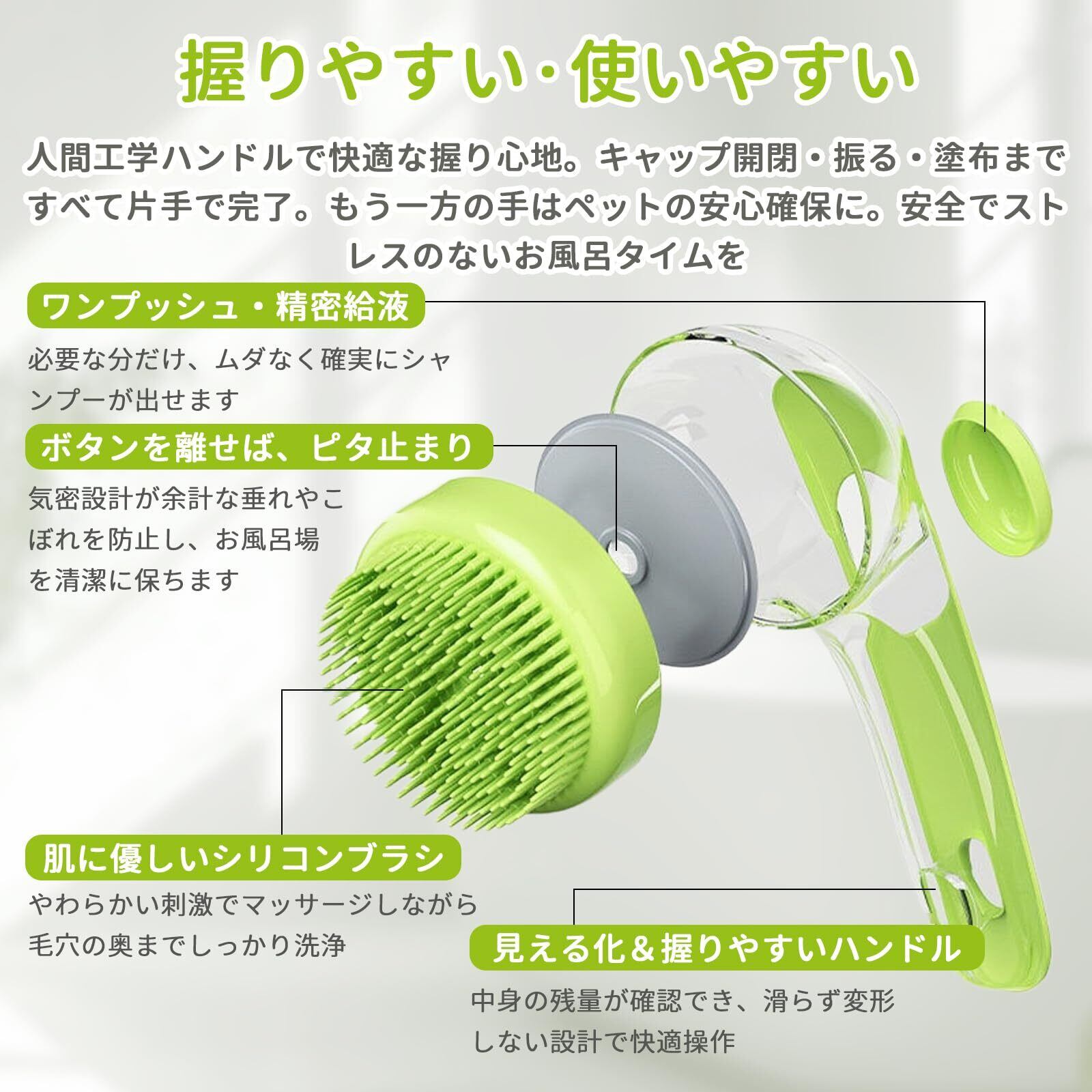 【精密な液漏れ防止】ブラシ中央の十字型の通気孔が空気圧を正確に調整し、シャンプーの液だれや無駄を防ぎます。密閉設計と相まって、入浴エリアを清潔に保ちながら、最適な量のシャンプーを提供します。シャンプーの無駄を最小限に抑えるだけでなく、使用中のコントロール性も向上します。