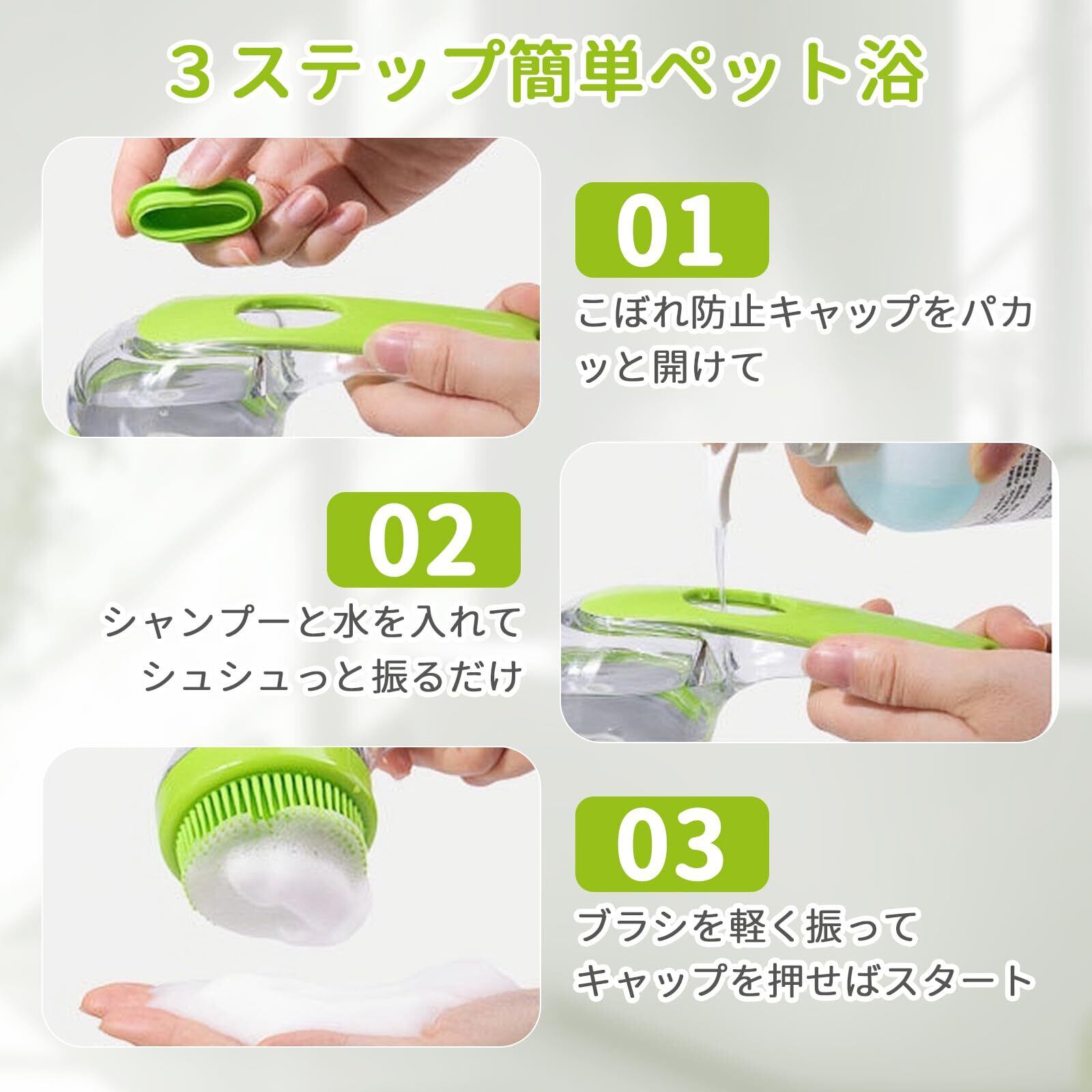 【時短3ステップ操作】防滴キャップを押し開け、シャンプーと水を入れて軽く振るだけです。ボタンを押すだけで最適な量のシャンプーが出てきて、簡単に泡立ちます。シャンプーを入れるという面倒な手順がなくなるので、活動的な愛犬でも簡単に入浴できます。
