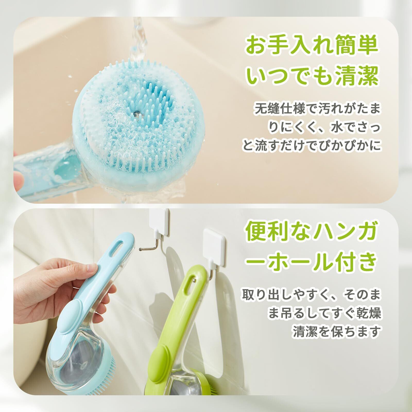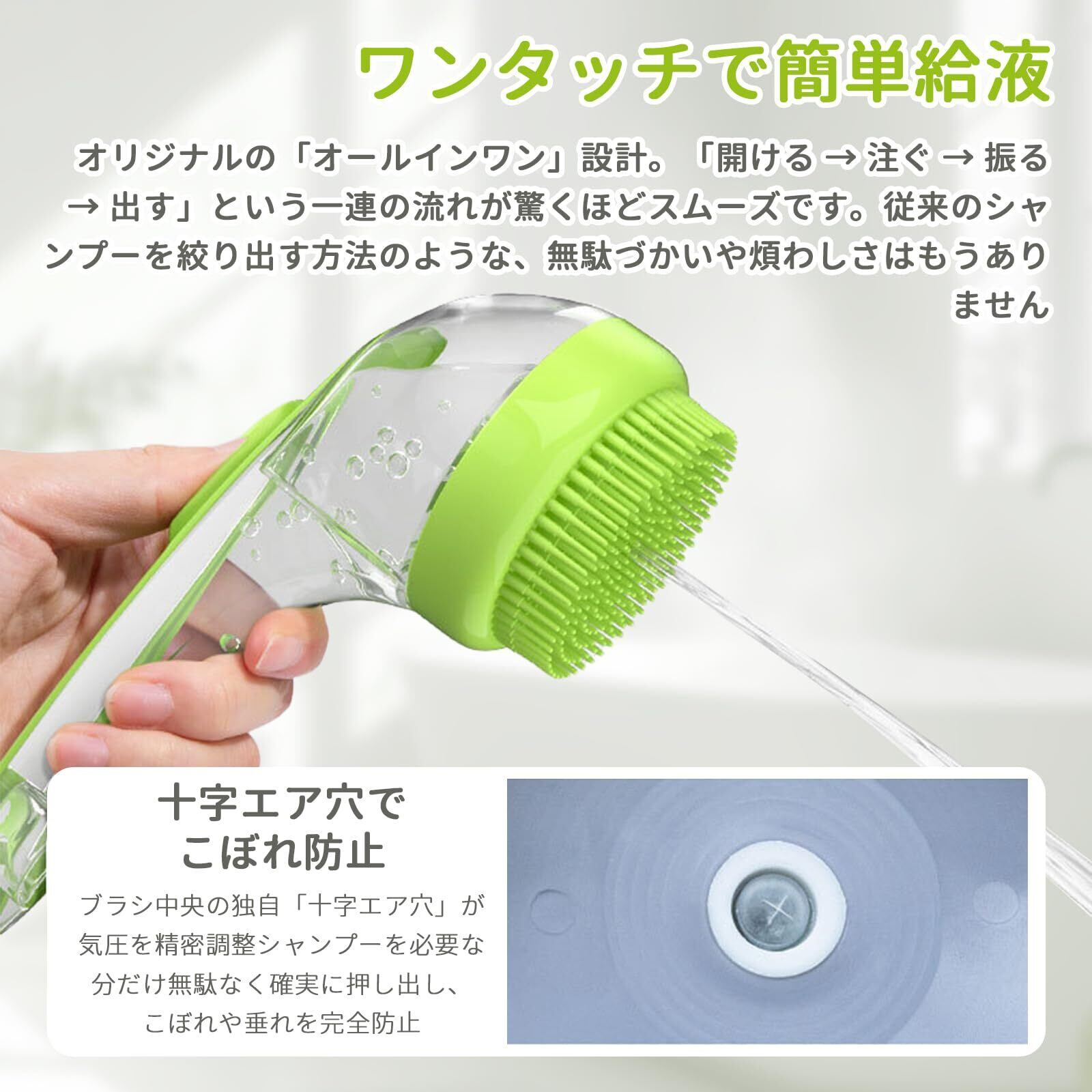 【精密な液漏れ防止】ブラシ中央の十字型の通気孔が空気圧を正確に調整し、シャンプーの液だれや無駄を防ぎます。密閉設計と相まって、入浴エリアを清潔に保ちながら、最適な量のシャンプーを提供します。シャンプーの無駄を最小限に抑えるだけでなく、使用中のコントロール性も向上します。