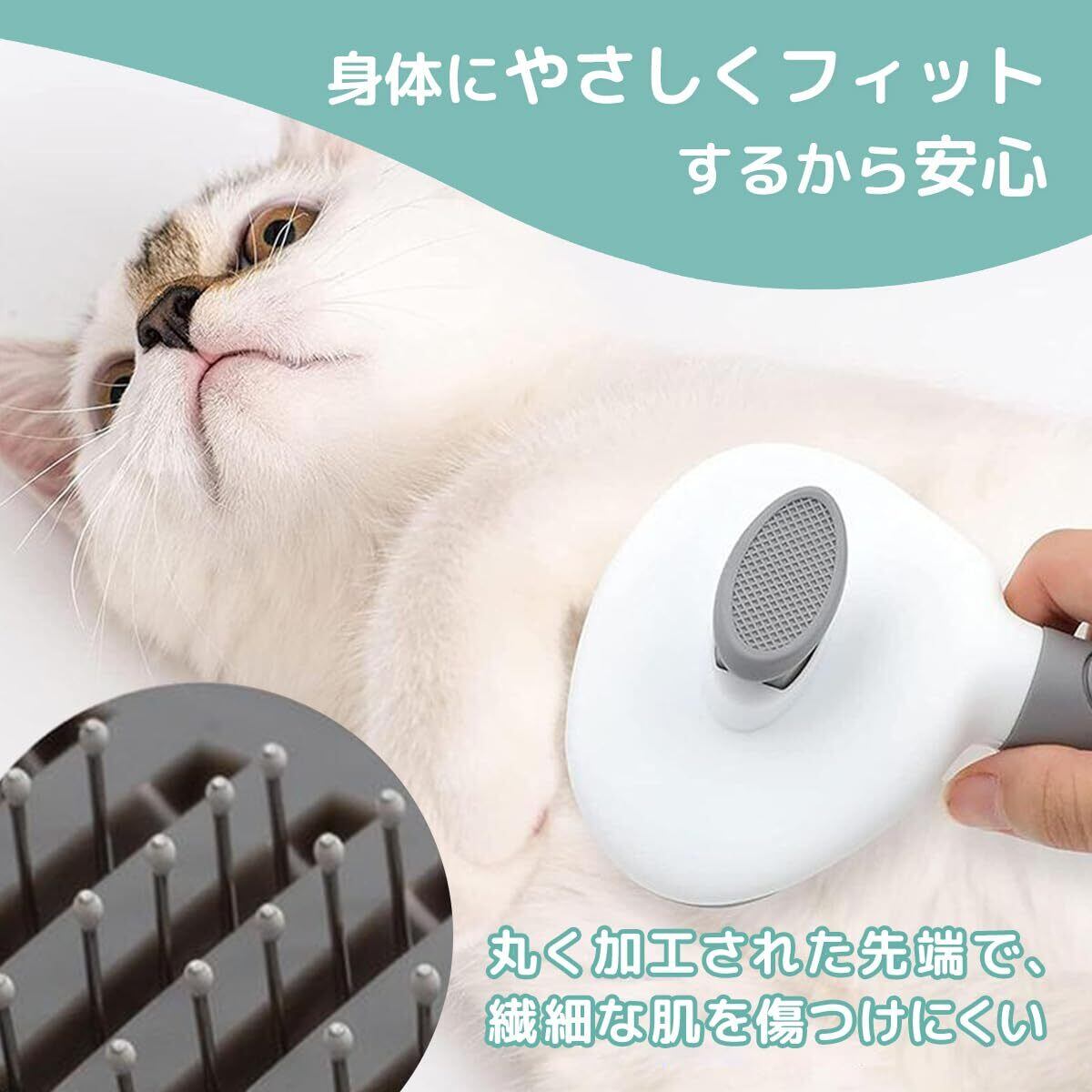 先端にはプラスチック製の丸いビーズを施しており、ペットのデリケートな皮膚を傷つけにくくなっています。やさしいタッチでブラッシングできるので、敏感な子や子猫・子犬にも安心して使えます。
