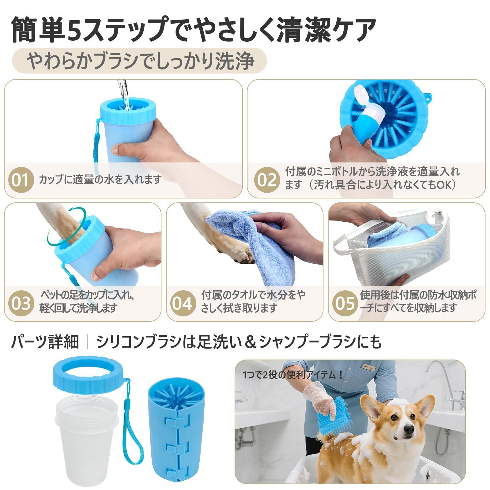 商品特長 外出後の足裏をすばやく洗浄し、室内の清潔を保ちます。柔らかいシリコンブラシでペットの足に優しく、360度しっかり洗えます。水洗い可能でお手入れ簡単、コンパクトで持ち運びにも便利です。