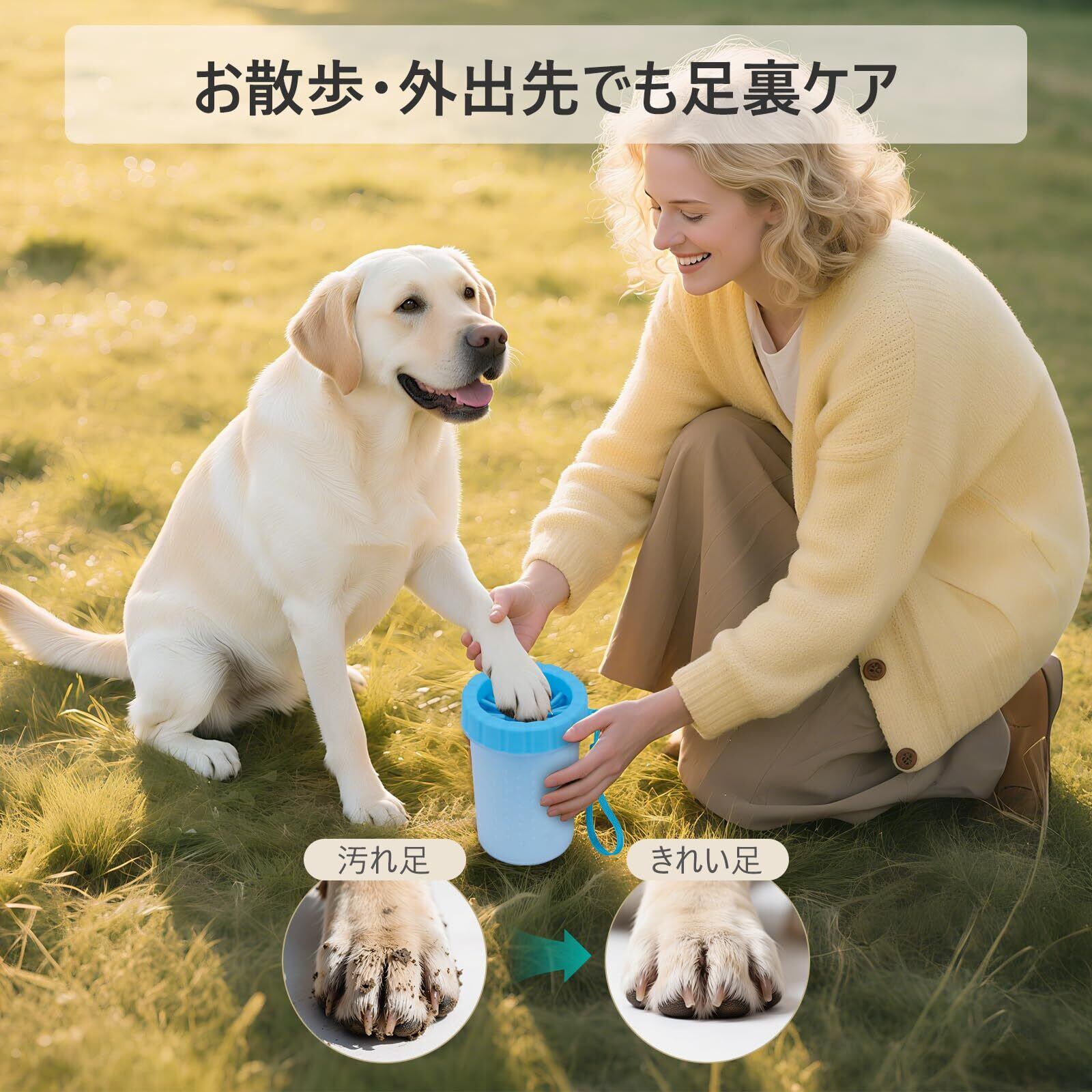 【お散歩後の足裏汚れも簡単ケア】— 散歩やお出かけ後の愛犬の足裏汚れを手軽にケア。汚れや細かな砂を優しく洗い流し、室内や車内を清潔に保てます。旅行や公園にも最適です。