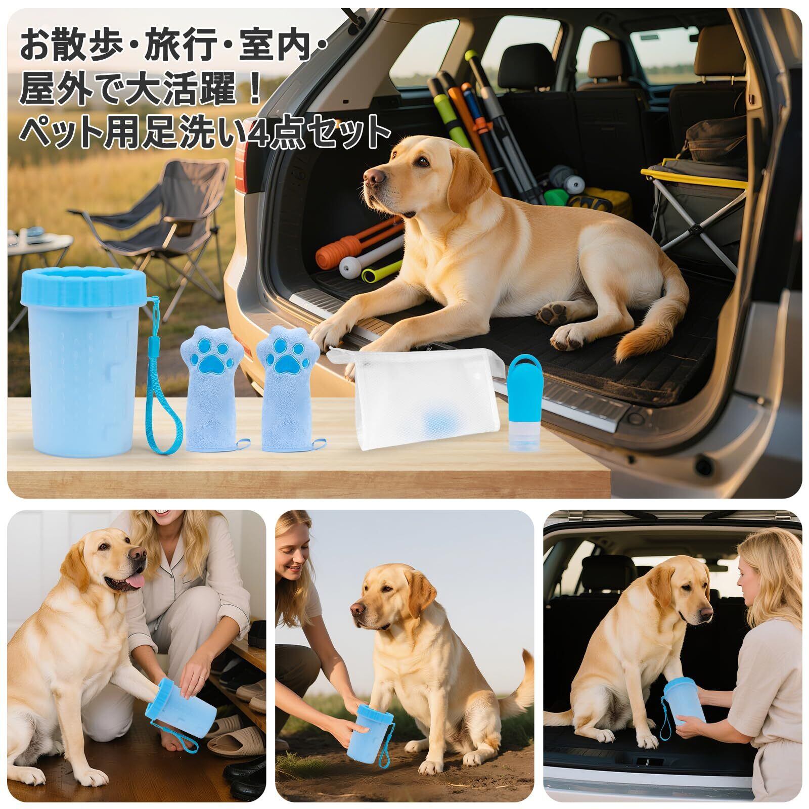 【特価商品】【nagasawa moko】犬用足洗いカップ・足洗い器|散歩後の足洗い・足拭き・泥落とし・肉球ケア・パウケアに便利なペット用足洗いグッズ 小型犬・中型犬・大型犬対応 ポータブル旅行用犬用品 4点セット