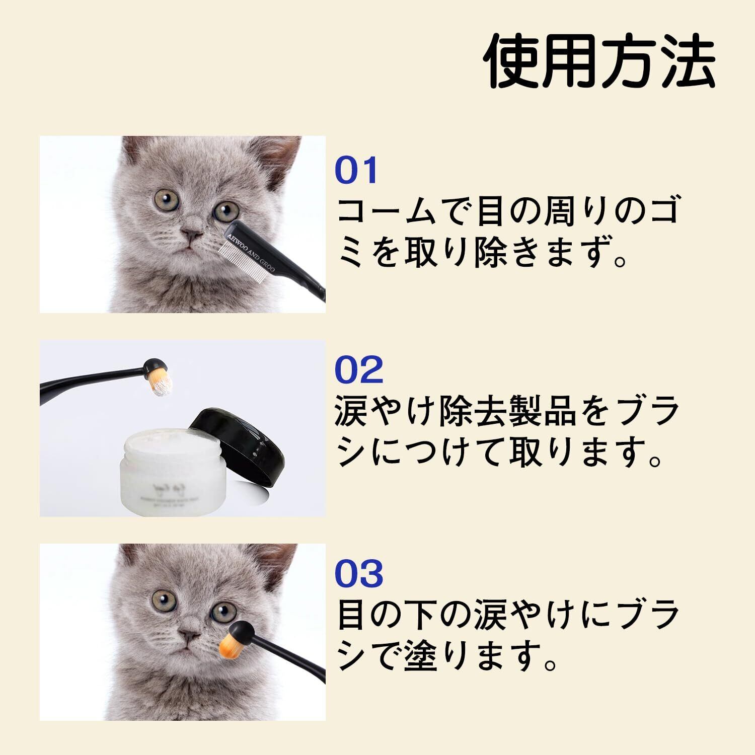 【使用方法】コームでペットの目周りの汚れを取り除き、ブラシに涙やけクリーナーをつけて目の下の涙のシミに塗ります。