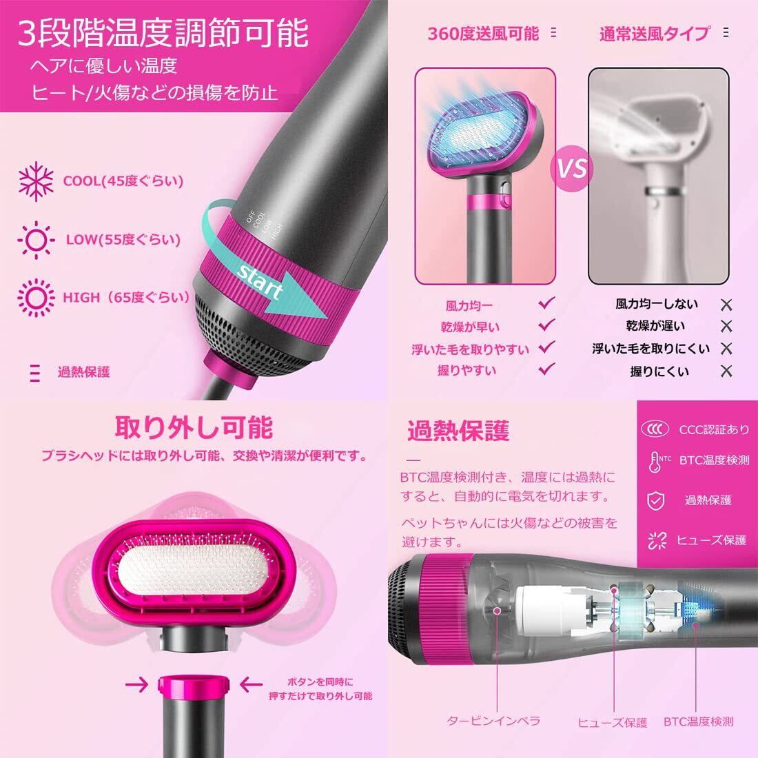 【静音、ブラシは取り外し可能】7枚羽根を搭載され、静音装置で音に敏感なペットちゃんに優しいです。不具合も無く快適に使えています。 ドライヤーのブラシヘッドは取り外しできて、交換も清潔も便利です。