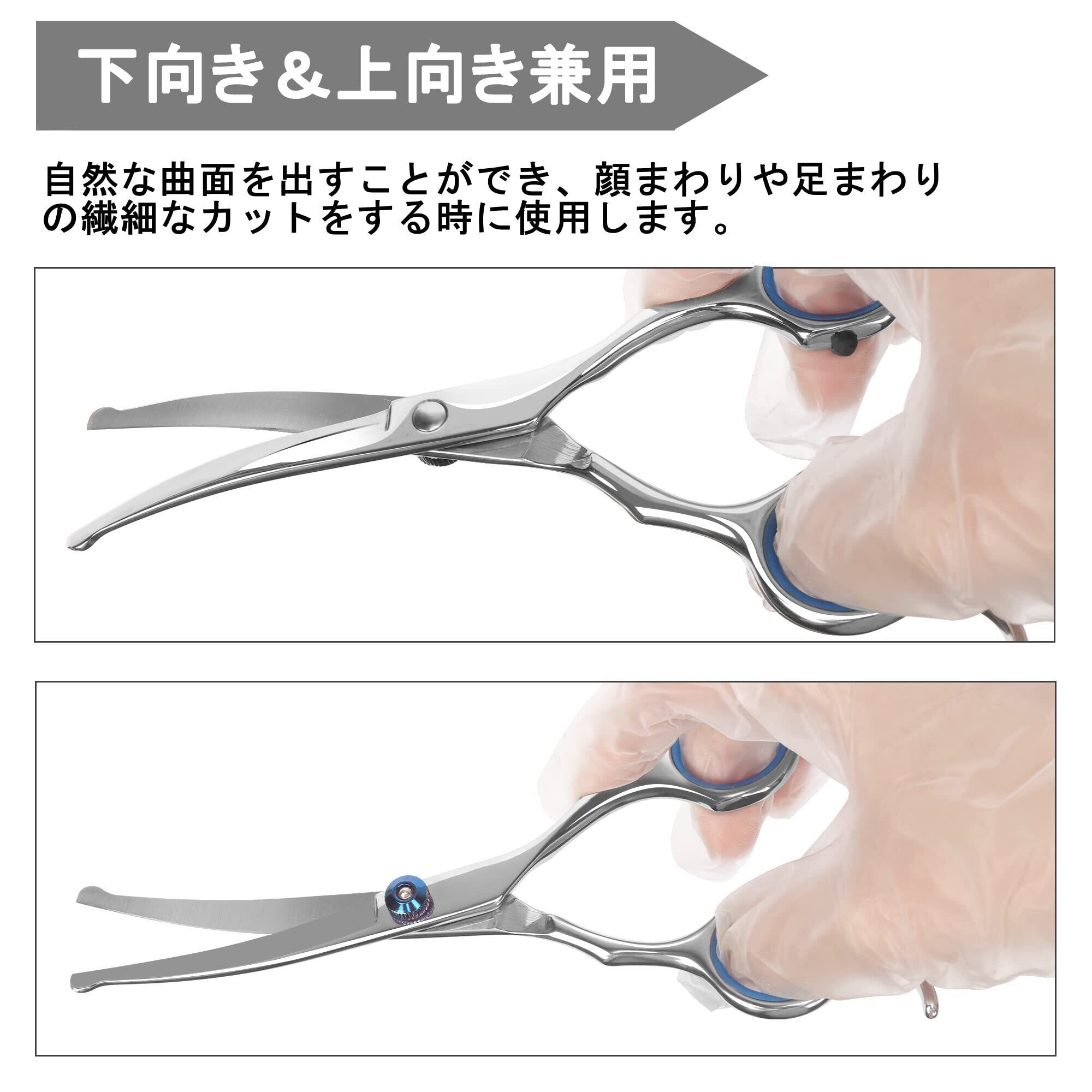 【下向き&上向き兼用はさみ】上向きはさみはペットの目、耳、足と尻周りの毛を細かくて調整できます。下向きはさみは顔、頭、ペット自身の弧度に合わせて可愛い造形を作れます。