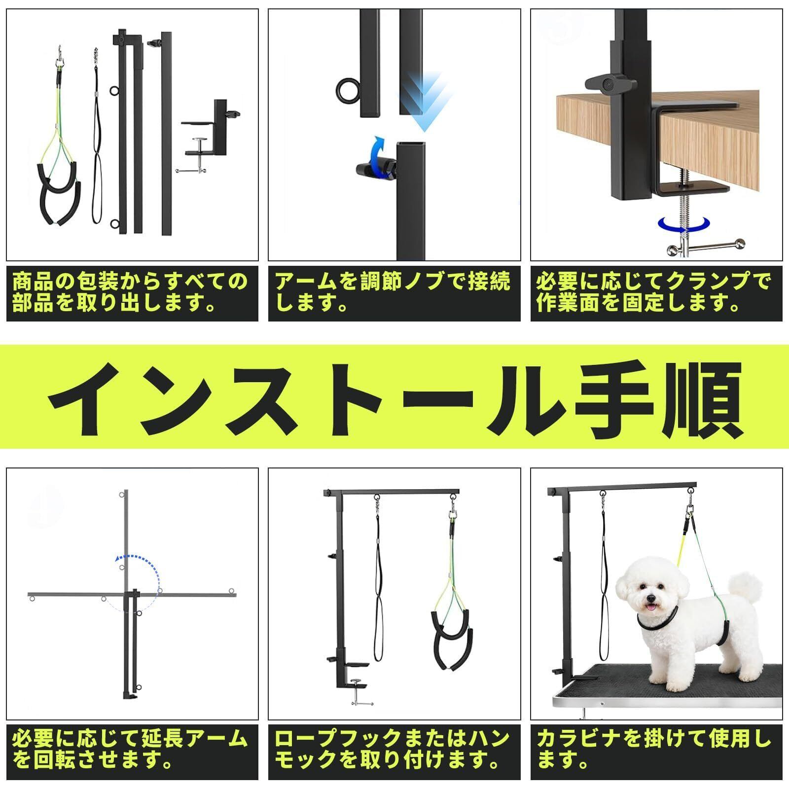 トリミングアーム 伸縮 高さ調整可能 ペットグルーミングスタンド 折り畳み トリミングテーブルアーム リミングハンモック付き トリミング台アーム 金属製 クランプ式固定 ポータブル 組立簡単 洗髪、トリミング、ブロー、コーミングに使用可能 小型犬・中型犬に適しています ペット用品 家庭用 プロ 業務用 収納袋付き 日本語説明書付き