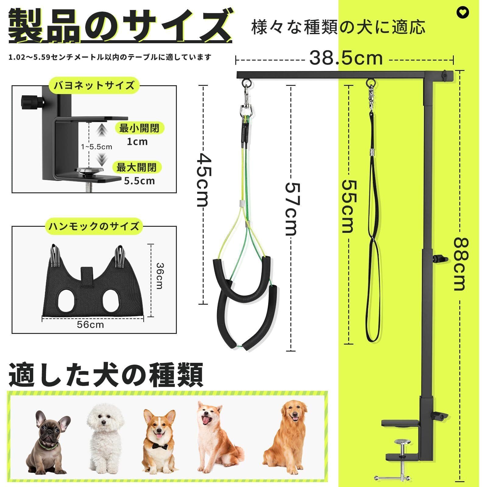 高さ調節可能なアーム:トリミングアームの高さは最大74cmまで自由に調節可能で、チワワから柴犬までさまざまなサイズの犬種に対応します。クランプの開口幅は1~5.5cmで、木製や大理石のテーブルにしっかり固定可能(ガラスターブルは不可)。ペットのサイズに合わせて最適な高さに簡単セッティングできるので、トリマーの作業姿勢も楽になり、ペットもリラックスします。