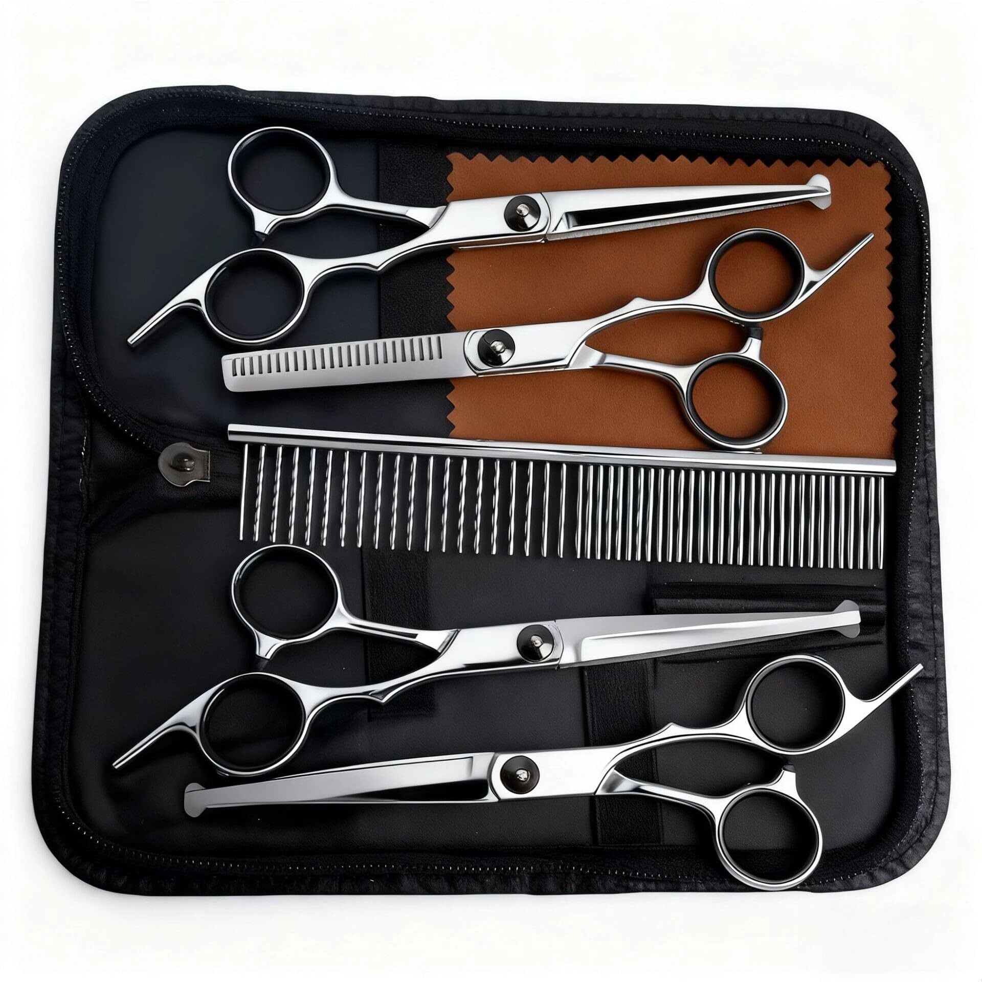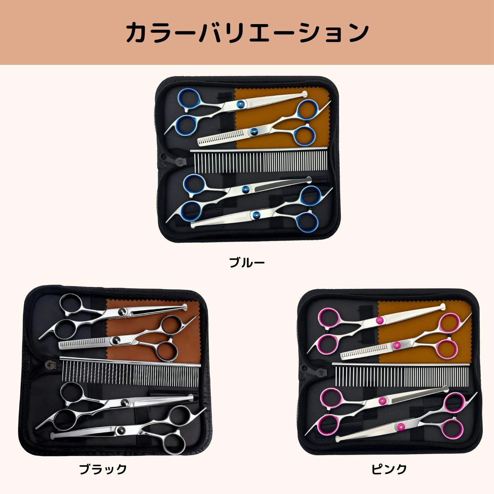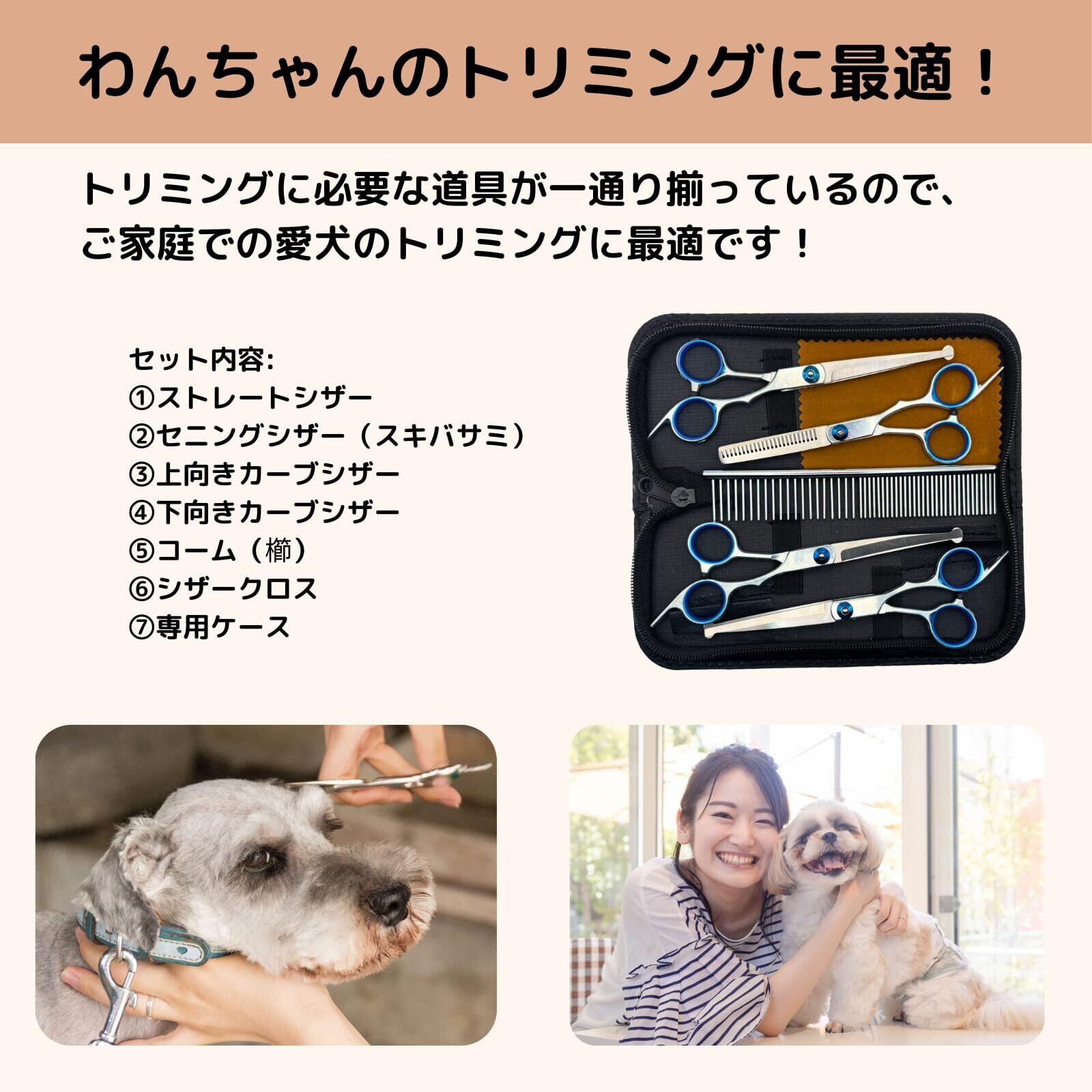 トリミング ハサミ 7点セット 犬 ペット用 初心者向け セニング すきばさみ ストレート 上向きカーブ 下向きカーブ 安全な丸い先端 コーム クロス ケース付属 (ブラック)
