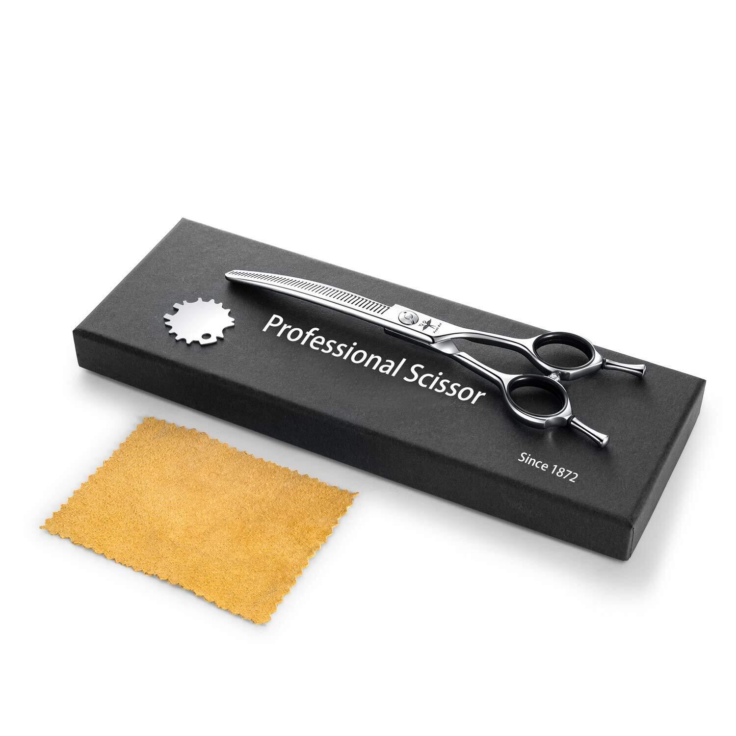 人間工学的&安全なデザイン - 取り外し可能なフィンガーインサートとフィンガーレストを備えた湾曲した薄切りはさみは、主に右利きグルーマー用に設計されており、左利きでも使用することもできます。 ブラントチップ あなたの可愛いペットの肌をケガから守ります。 高反発マフラーはハンドル間の摩擦を減らし、大きな音を出すのを防ぎます。 湾曲したブレードは、顔、耳、足、鼻、手足などの敏感な部分をグルーミングするのに便利です。