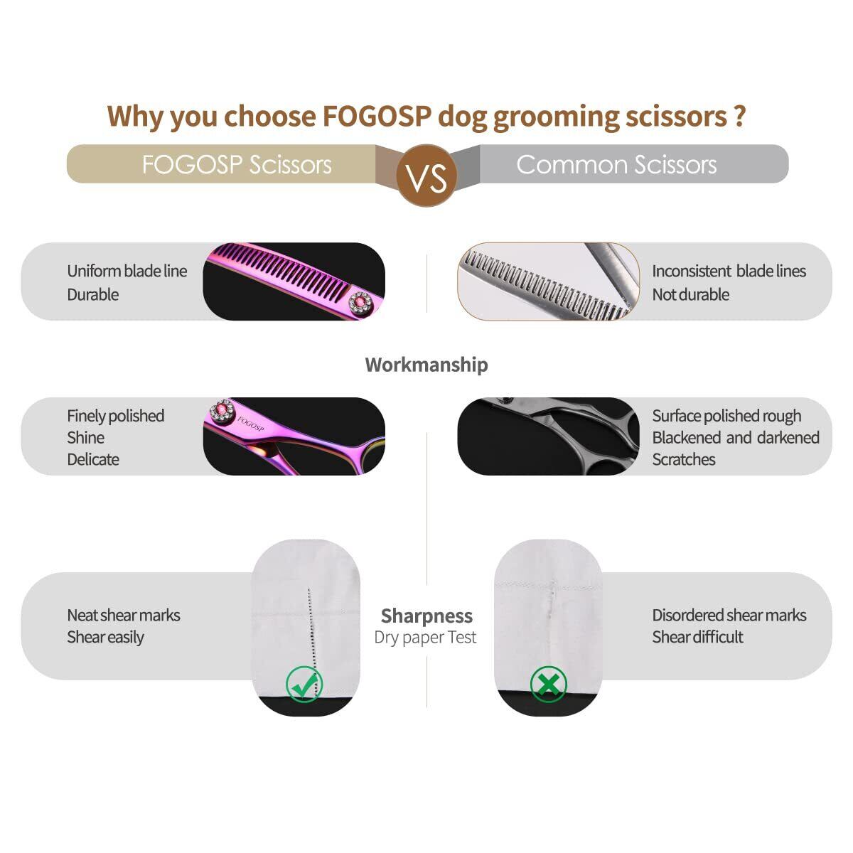 FOGOSPは高品質のペットグルーミング鋏に焦点を当てており、各ハサミは高品質のステンレススチール製で、プロの技術マスターマニュアル研磨製造で、3回以上の慎重なテストを経て、手に届くハサミが完璧な製品であることを保証します。