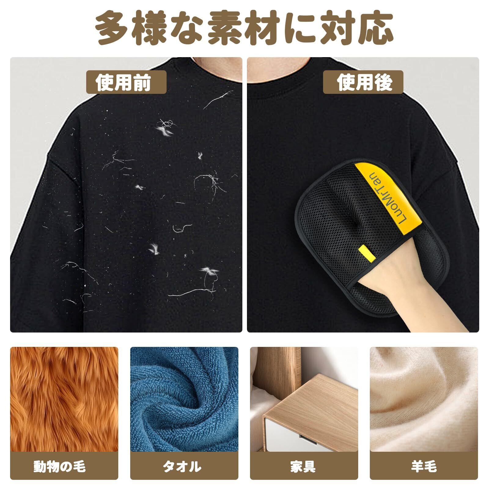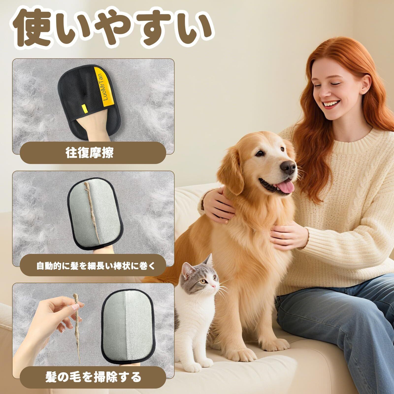 ✤【静電気吸着と人間工学設計】滑り止めグリップを採用し、手の形に自然にフィット。左右どちらの手でも効率的に使用でき、左右どちらの手にも装着可能です。表面を軽く滑らせるだけで、静電気でペットの毛を簡単に吸着。お手入れが素早く楽になります。
