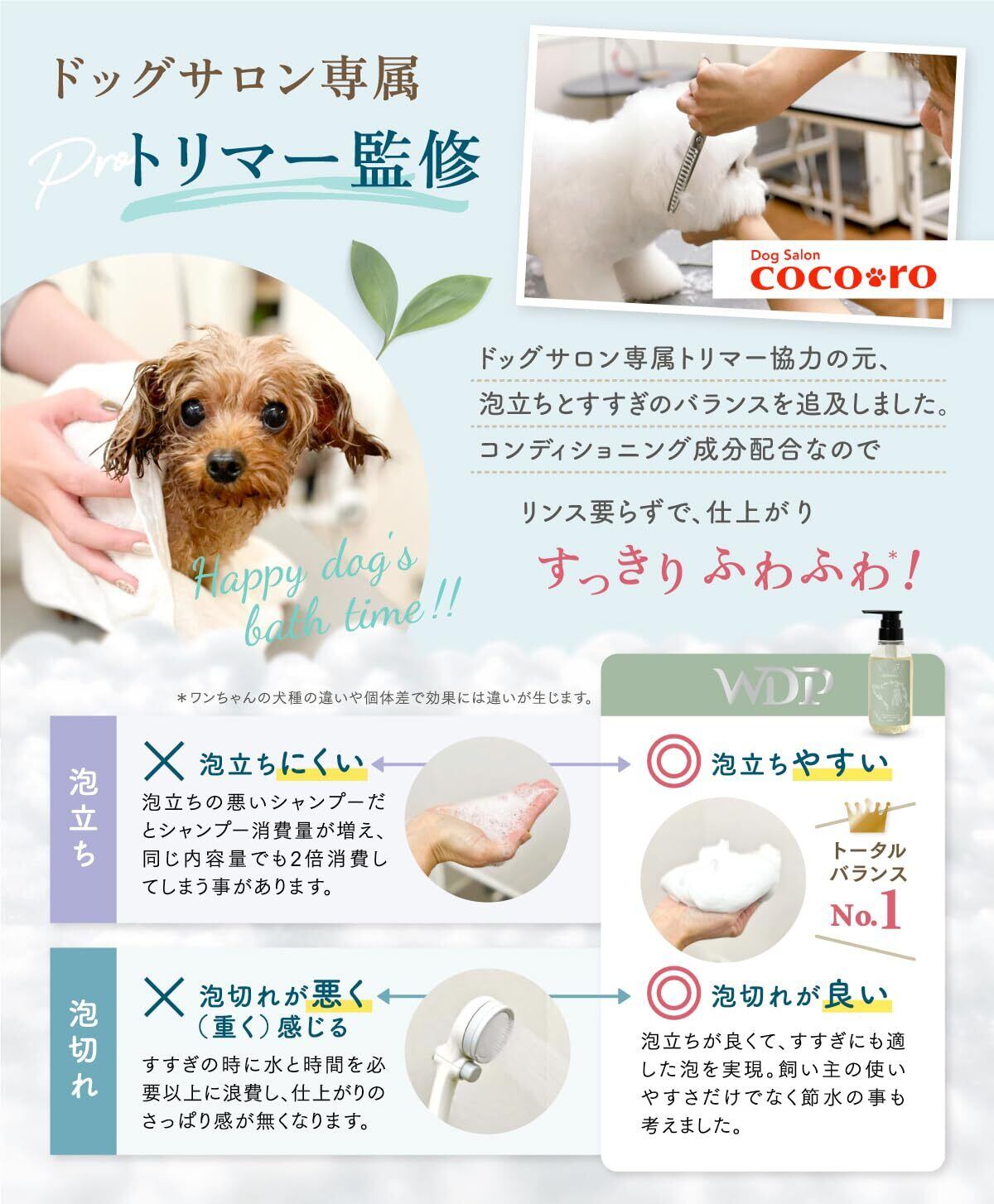 ドッグサロン専属トリマー監修で泡立ちとすすぎのバランスを追及しました。 泡立ちが悪いと2倍のシャンプー消費につながる事もありますし、泡切れが悪く重く感じる泡だとすすぎの時に水を大量に消費してしまいます。WDPドッグシャンプーは泡立ちと泡切れの両立を実現。