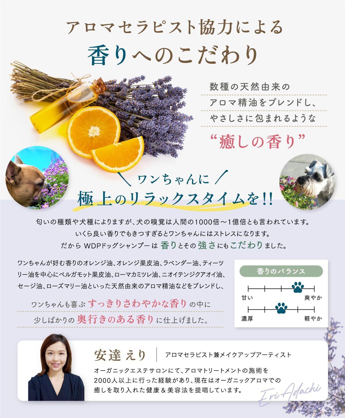 アロマセラピスト協力の元、ワンちゃんが好むオレンジ油、ラベンダー油、ティーツリー油などを配合し、すっきり爽やかな香りの中に、少しばかりの奥行きのある香りに仕上げました。ワンちゃんは嗅覚が強いので香りが強すぎると逆にストレスに。WDPドッグシャンプーは香りの強さにもこだわりました。