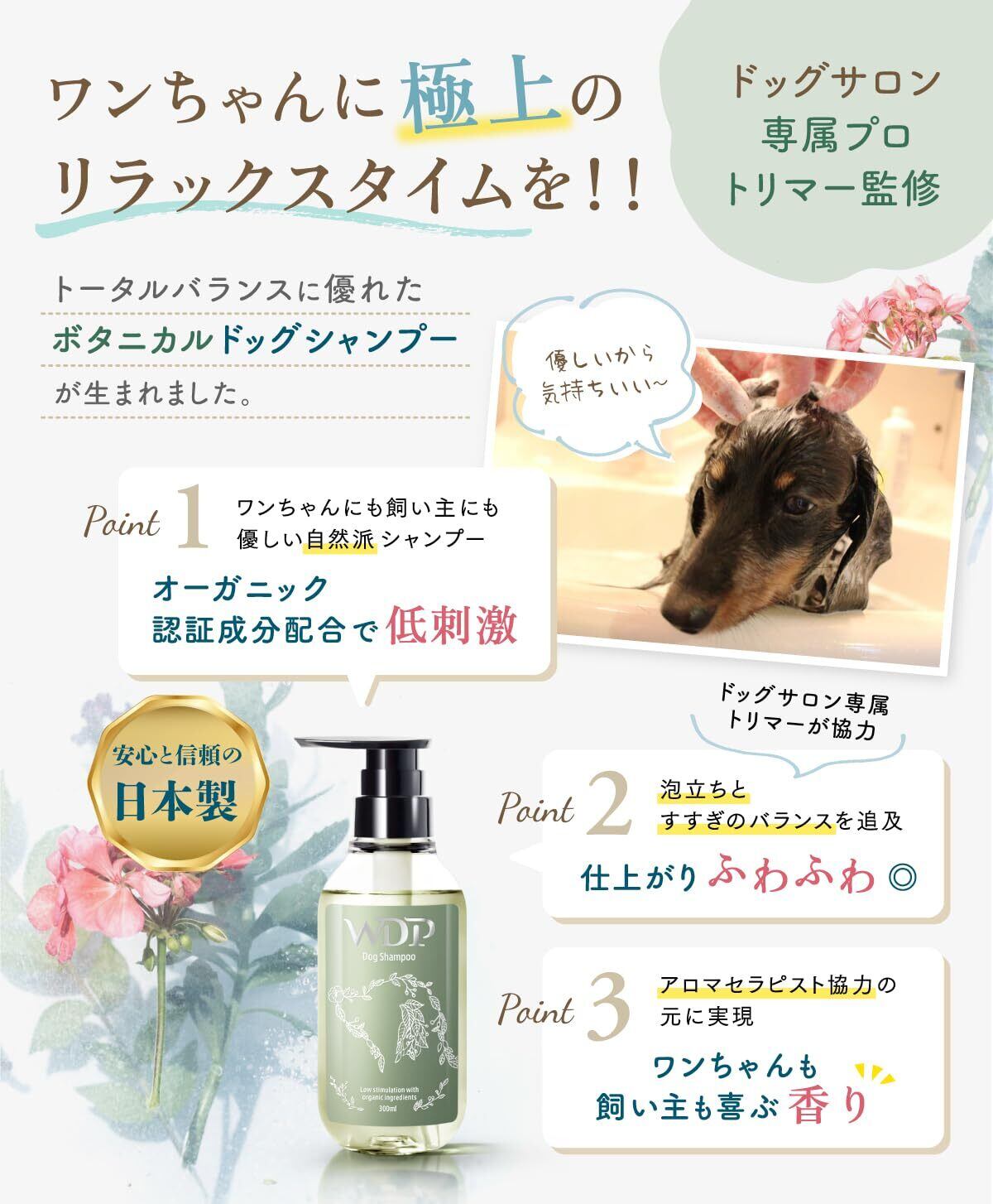 【新着商品】犬シャンプー 【ドッグトリマー監修】300ml低刺激ボタニカル(リンスのいらない)犬用シャンプー オーガニック認証成分配合WDPドッグシャンプーいい香り(全犬種)日本製 (1本)