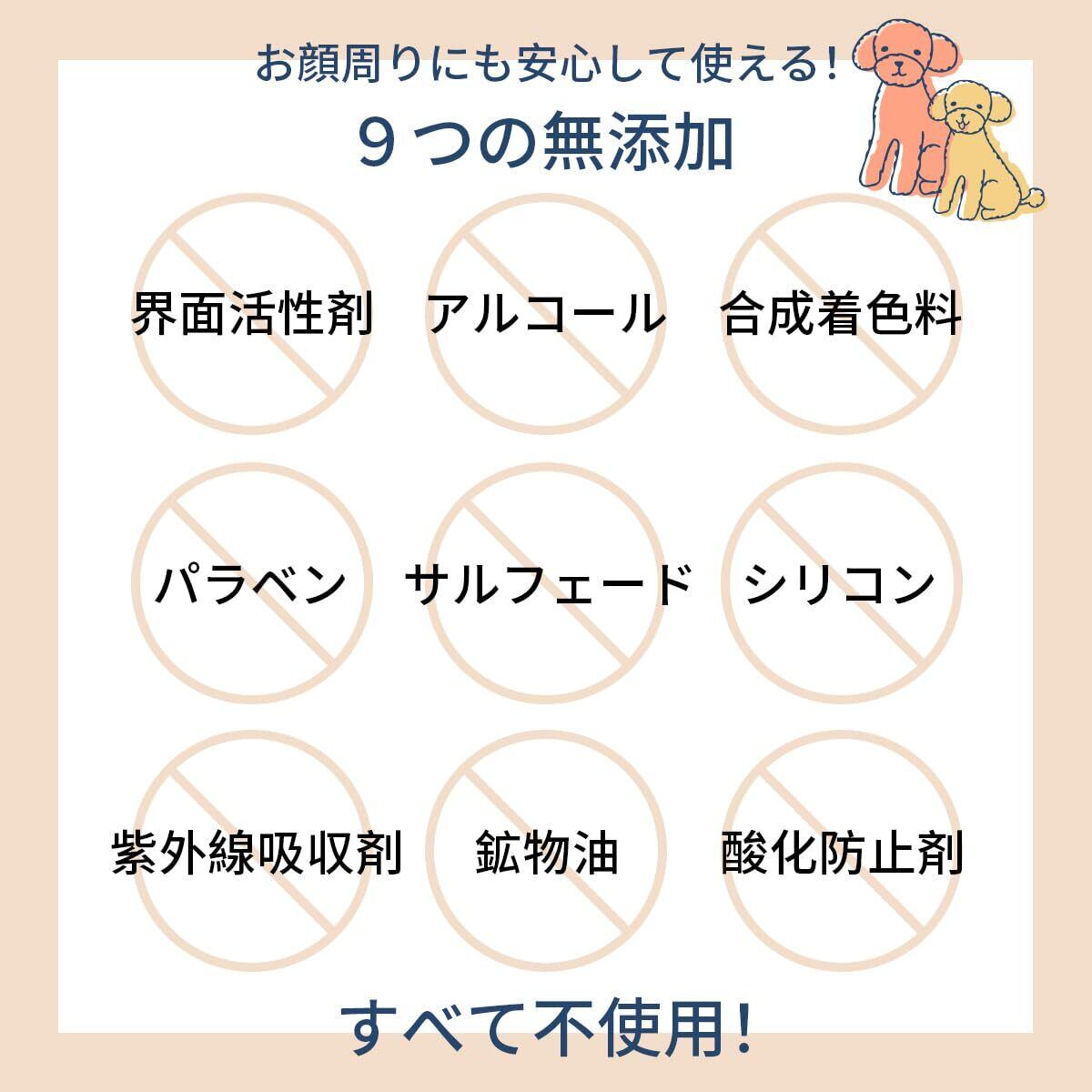 【デリケートなお顔まわりにも安心】お顔の3分の1ほどの大きさがある犬の瞳に付着するほこりやチリによる汚れや着色、さらに食事後の食べかすやお散歩時の「クン活」によるお口まわりの汚れ、ニオイなど、愛犬のお顔まわりは毎日のケアがオススメです。 超電解イオン水をベース二複合アミノ酸などを配合した洗洗い流しのいらない泡シャンプーで愛犬にストレスをかけずすっきり清潔に。きめ細かい泡が表面だけでなく毛穴にまで届きます。天然由来成分100%だからデリケートなお顔周りにも安心してお使いいただけます。